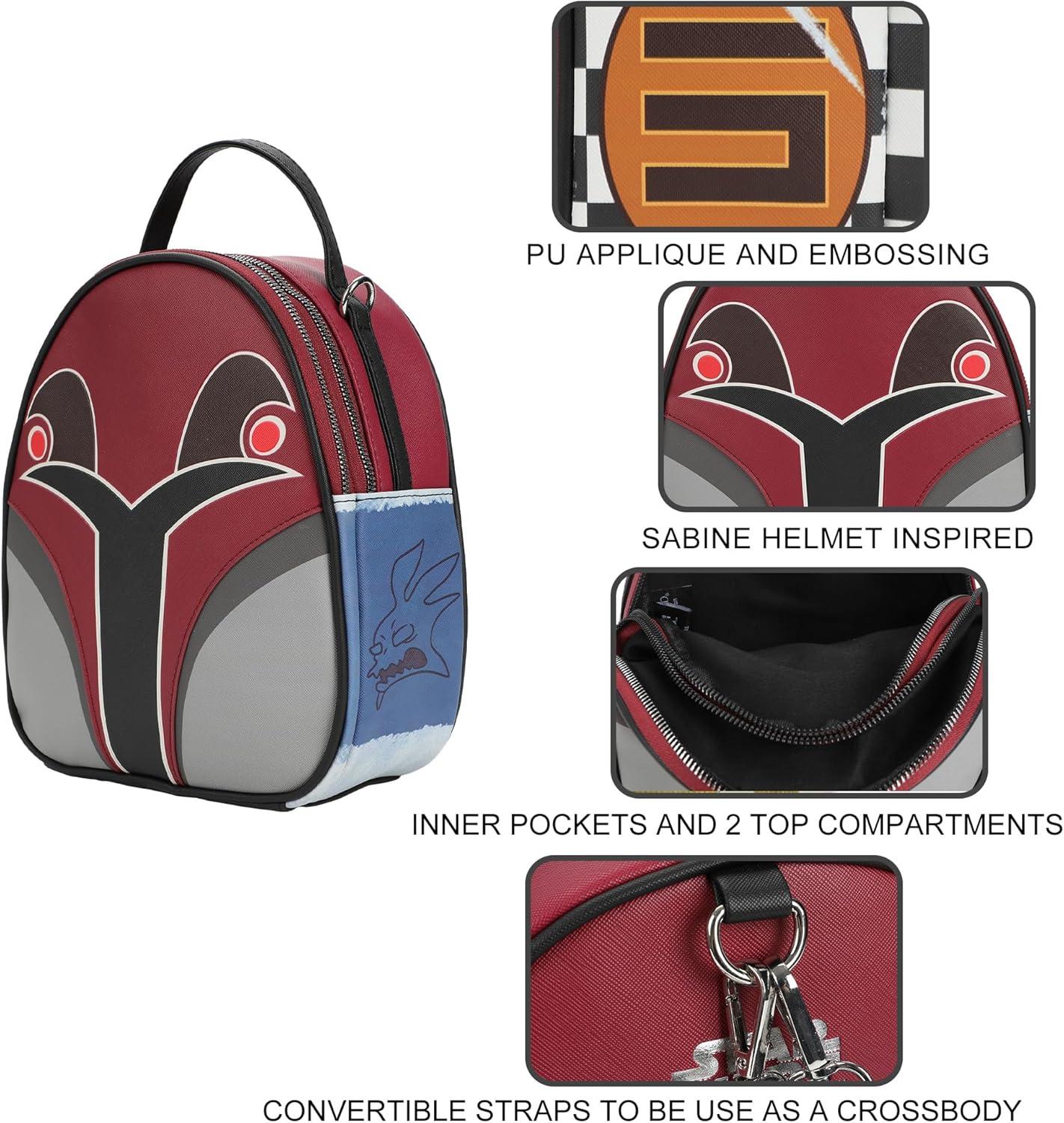 CUSTOM DESIGN: Embrace the unmistakable design of Sabine's helmet with this mini backpack showcasing vivid details like the loth cat illustration and the Mandalorian symbol, standing out as an iconic Star Wars-inspired creation.