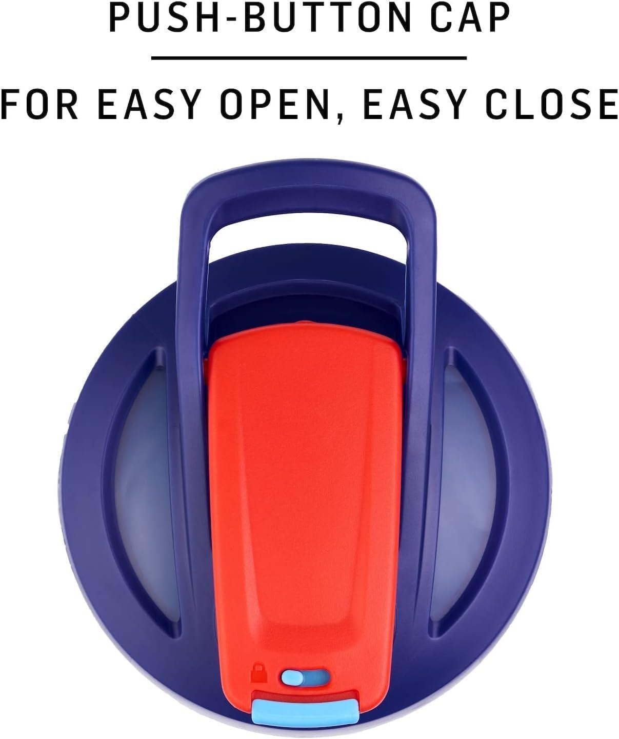 Spill-Proof Lid: The push-button flip cap with sliding lock prevents accidental opening and spills.