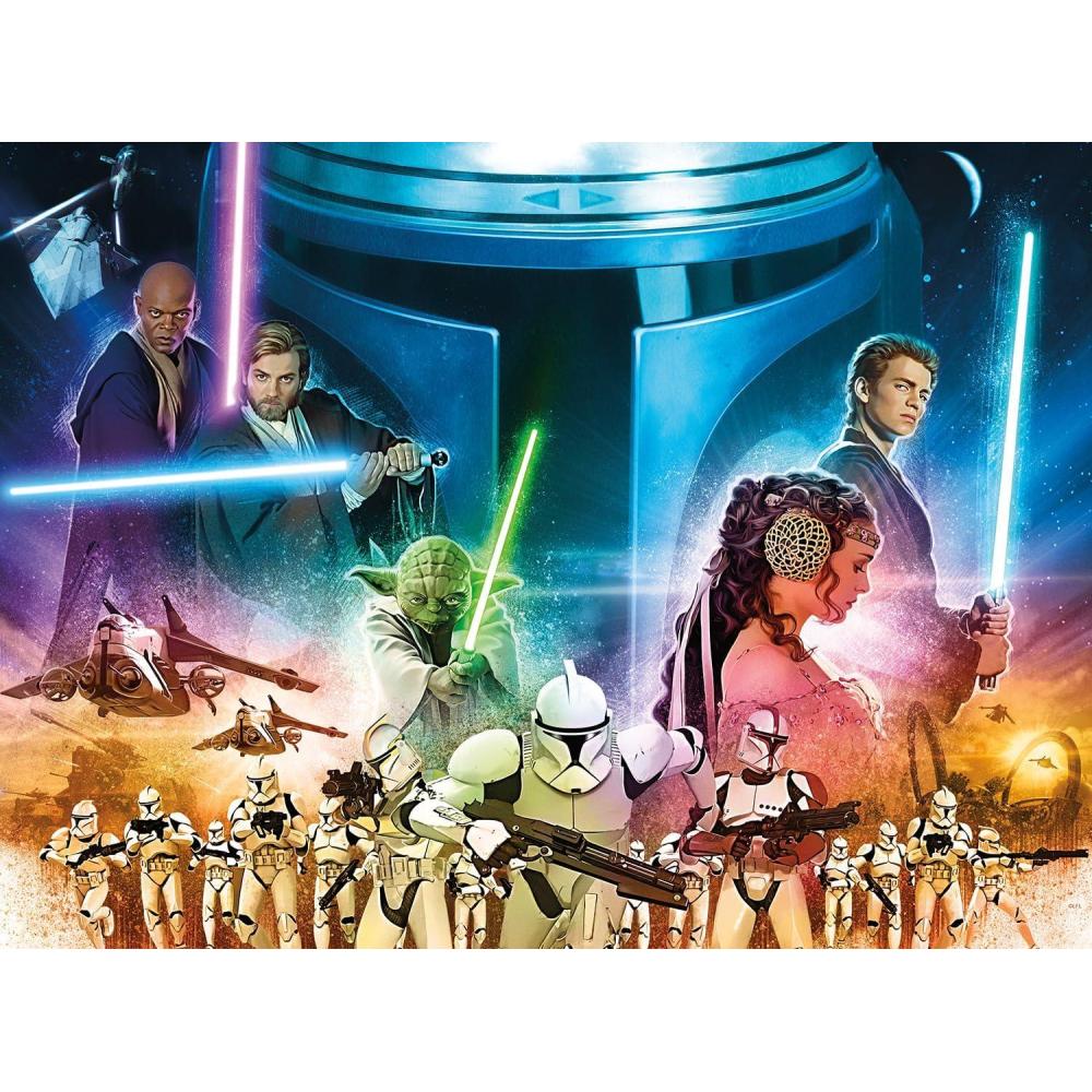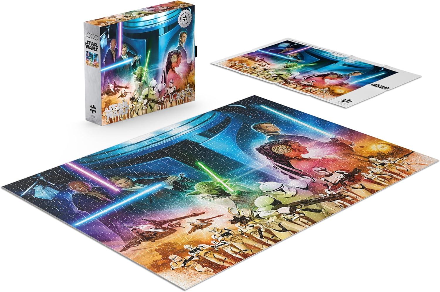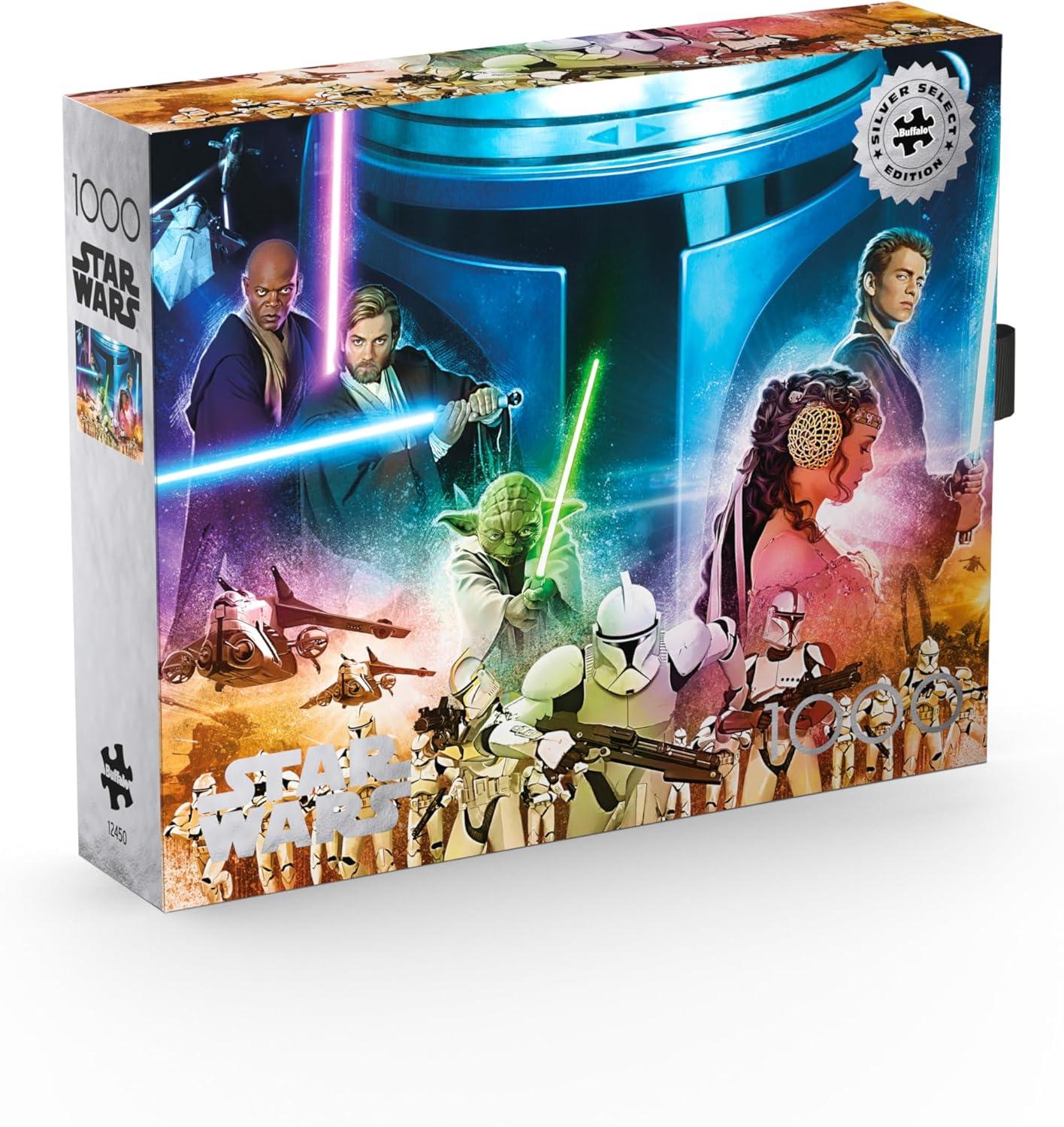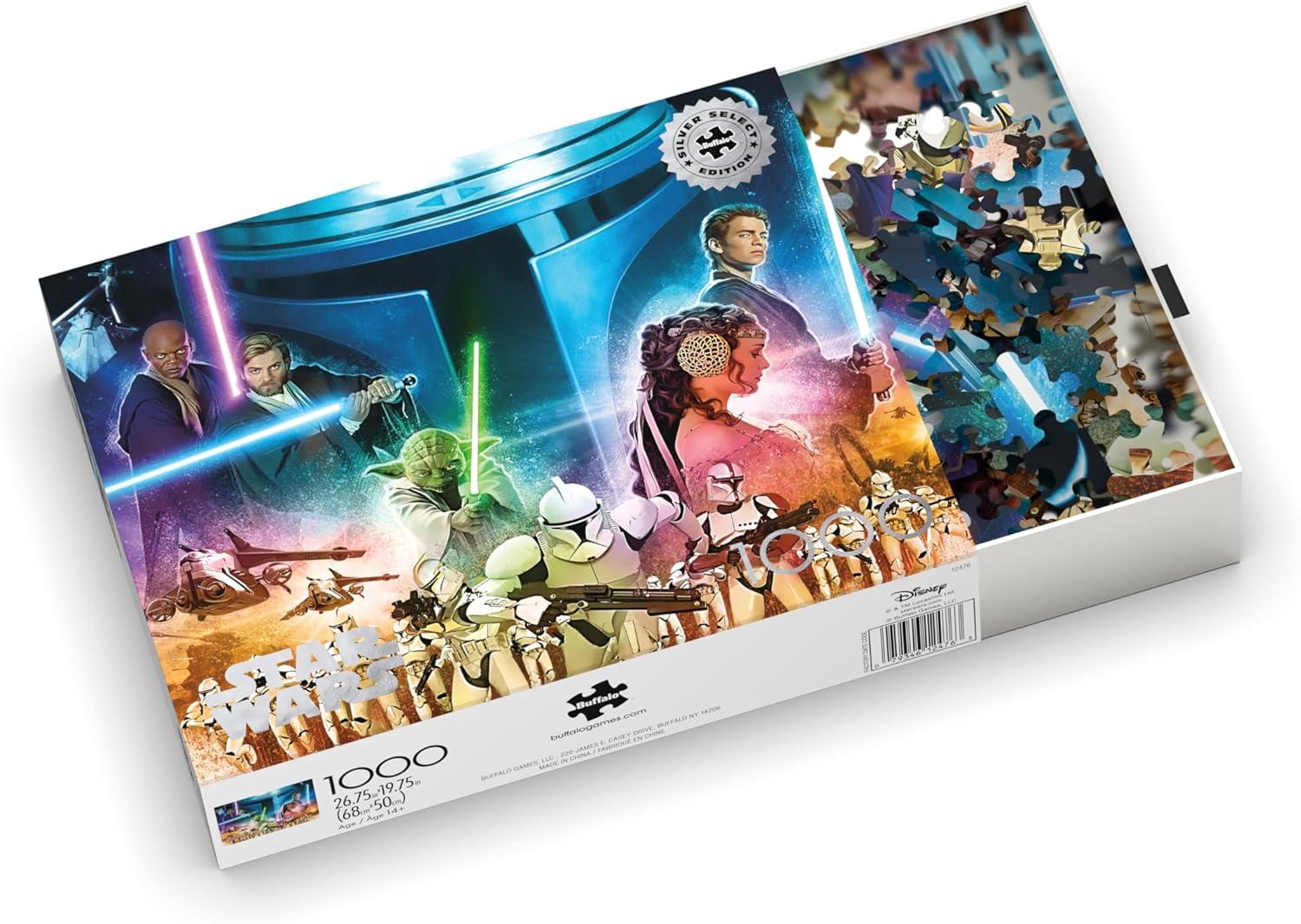 This 1000-piece Star Wars™ Silver Select Puzzle is created for the Star Wars™ fan. It depicts a collage of beloved characters from Star Wars: Attack of the Clones™. The Silver Select puzzles are curated and timeless images from The Walt Disney Company, Lucasfilm, and more. They are packaged in a giftable box with silver foil accents, use premium recycled puzzle board, and include a full-color diagram. Every Buffalo Games jigsaw puzzle is manufactured from recycled puzzle board. A precision cutting technique guarantees that every piece will fit soundly with the company's signature Perfect Snap™. A bonus puzzle poster is also included so that you have a handy reference of what the completed puzzle should look like while you put yours together. © & ™ Lucasfilm Ltd.