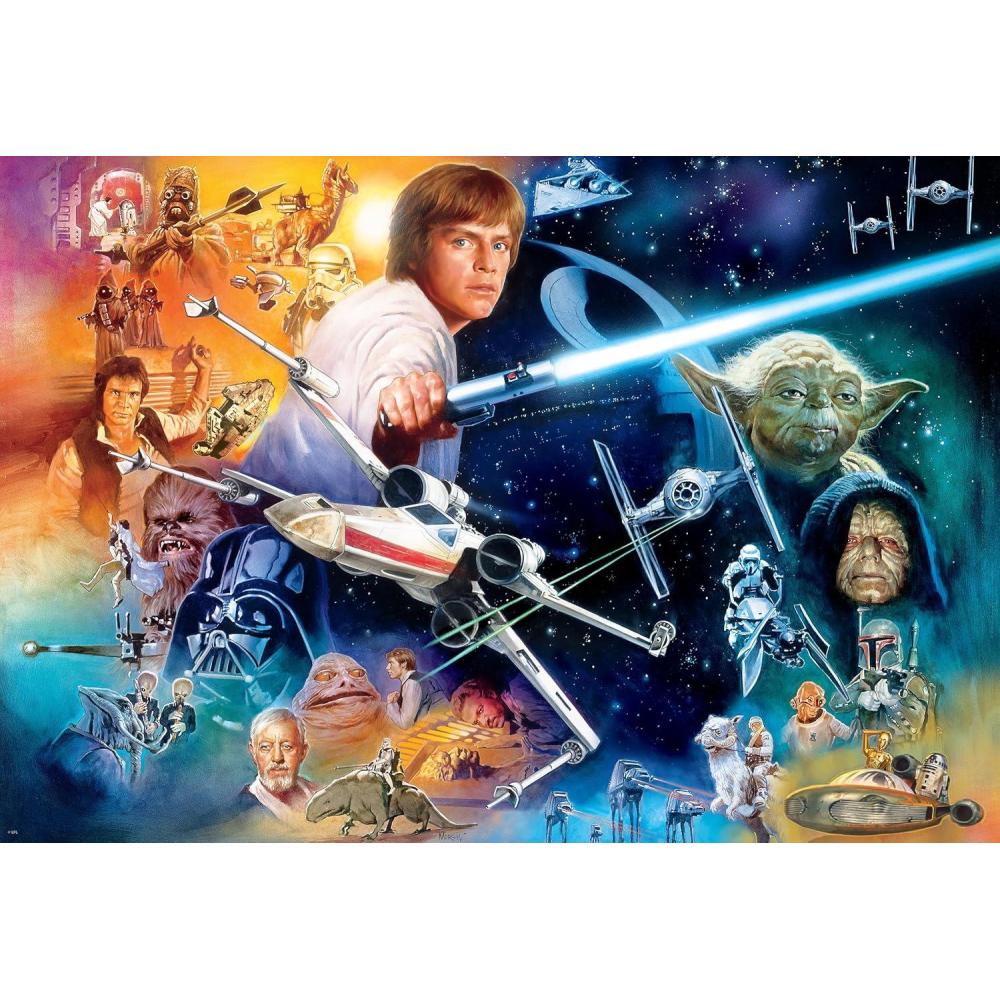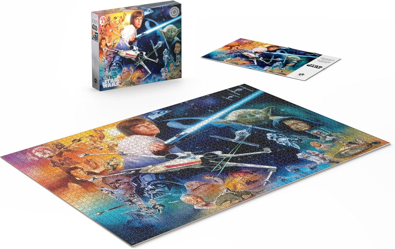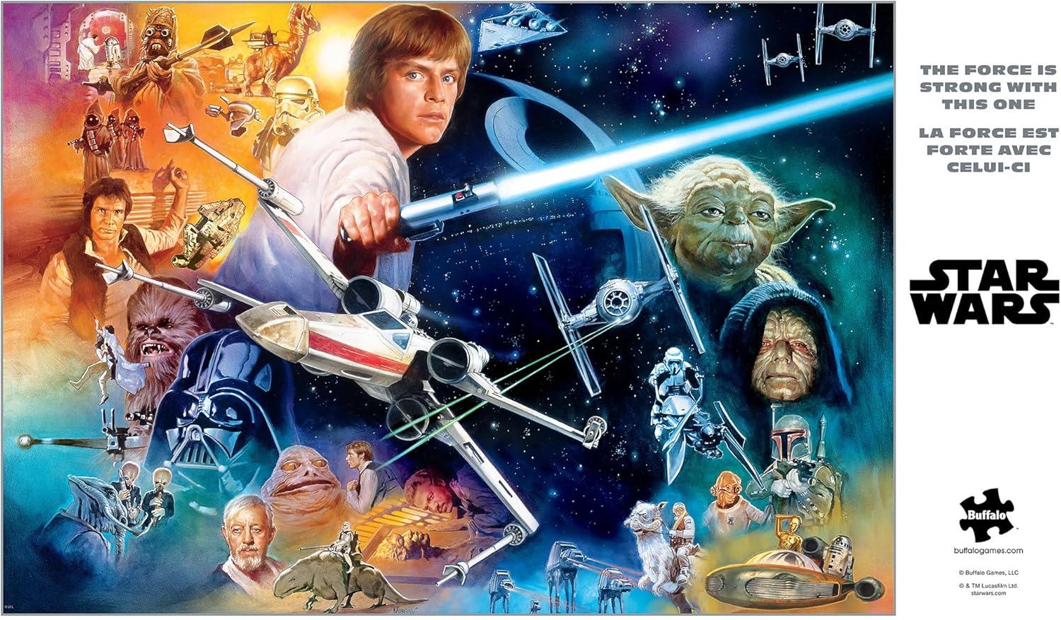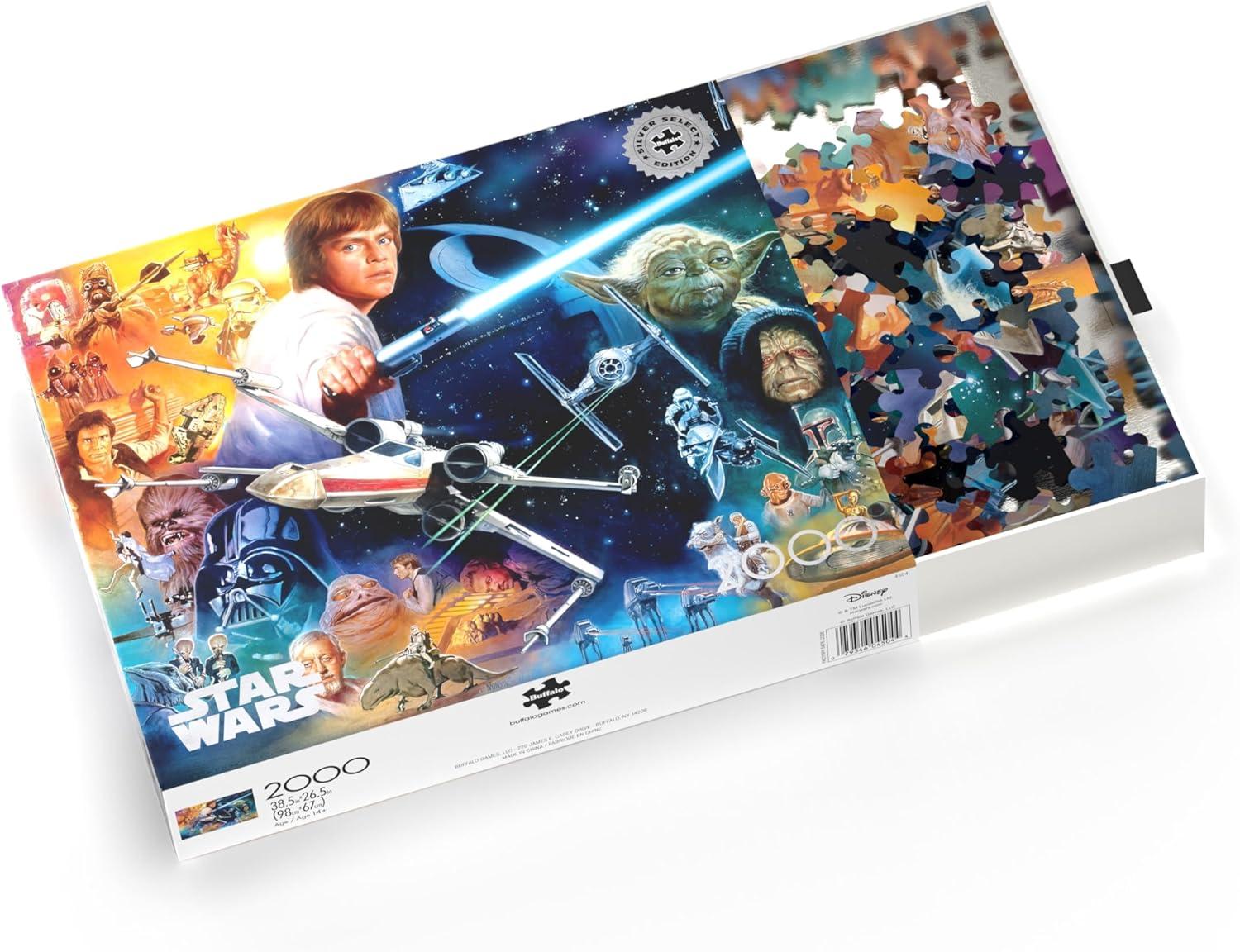 “The Force Is Strong With This One” is a 2000-piece Star Wars™ Silver Select Puzzle and is created for the Star Wars fan. Luke Skywalker, Darth Vader, Princess Leia, Han Solo, Yoda, Obi-Wan Kenobi, the Emperor and more are shown in this spectacular collage of galactic proportions. The Silver Select puzzles are curated and timeless images from The Walt Disney Company, Lucasfilm, and more. They are packaged in a giftable box with silver foil accents, use premium recycled puzzle board, and include a full-color diagram. Every Buffalo Games jigsaw puzzle is manufactured from recycled puzzle board. A precision cutting technique guarantees that every piece will fit soundly with the company's signature Perfect Snap™. A bonus puzzle poster is also included so that you have a handy reference of what the completed puzzle should look like while you put yours together. © & ™ Lucasfilm Ltd.