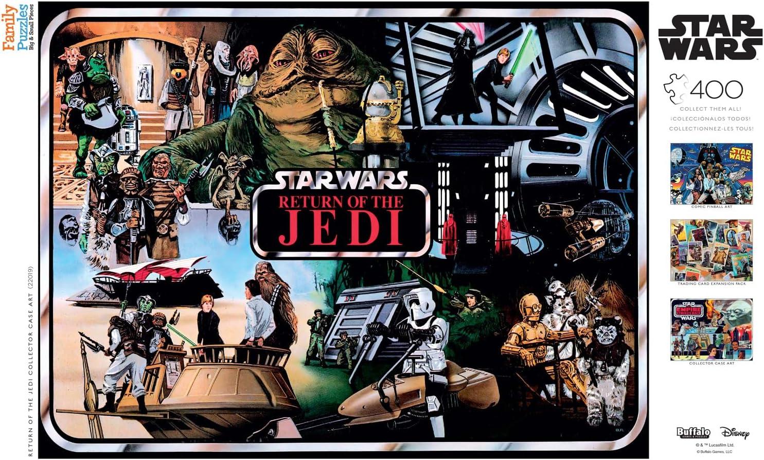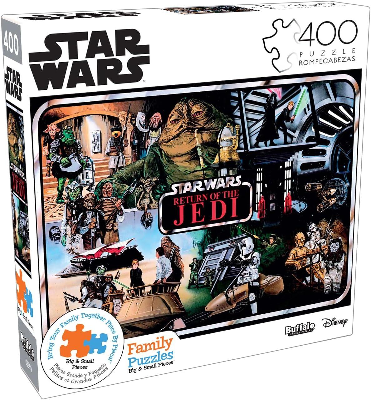 This 400-piece Star Wars™ jigsaw puzzle by Buffalo Games features a collage of scenes and iconic characters from Star Wars: Return of the Jedi™, including images of Jabba the Hutt, Darth Vader, Luke Skywalker and more! This jigsaw puzzle is a Buffalo Games Family Puzzle that is made with big and small puzzle pieces. The big pieces are easier to handle and put together making them perfect for kids while the small pieces are still a challenge for adults. This puzzle makes it easy for the whole family to participate! Every Buffalo Games jigsaw puzzle is manufactured from recycled puzzle board. A precision cutting technique guarantees that every piece will fit soundly with the company's signature Perfect Snap™. A bonus puzzle poster is also included so that you have a handy reference of what the completed puzzle should look like while you put yours together. © & ™ Lucasfilm Ltd.