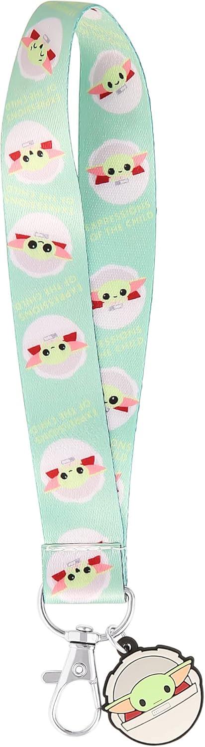 Polyester fabric lanyard has a lobster claw clip with a key ring and cute Grogu rubber charm