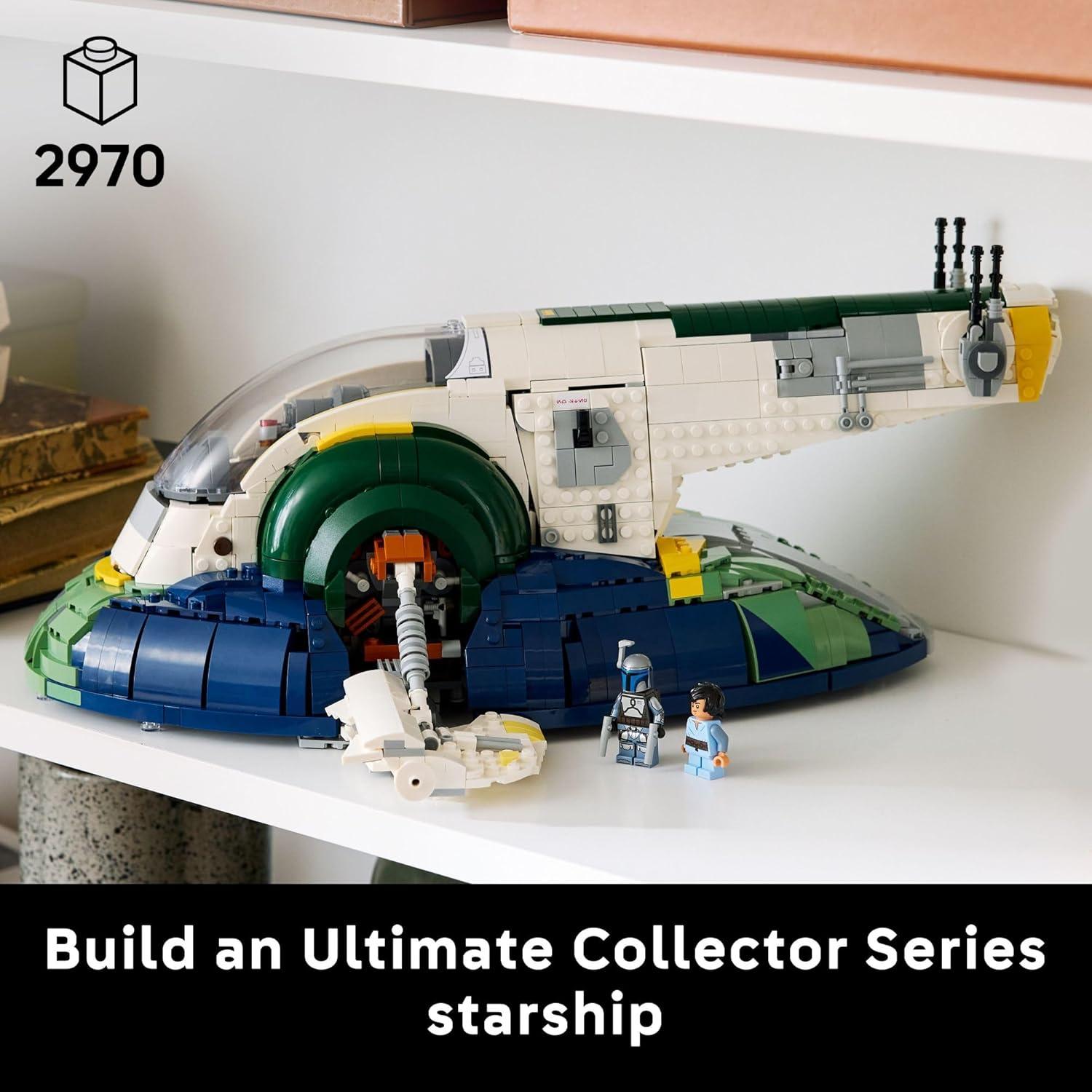 Let imagination transport you to a galaxy far, far away with the LEGO Star Wars Jango Fett's Firespray-Class Starship (75409) building set for adults 18 years old and up. Part of the LEGO Ultimate Collector Series (UCS), this model kit challenges you to recreate authentic details of an iconic starship from Star Wars: Attack of the Clones. Immerse yourself in Jango and Boba Fett's dangerous world of bounty hunting as you assemble precision-engineered features. Discover a detailed cockpit with removable canopy revealing intricate controls, a press-down main entrance, and a compartment containing a seismic charge. Once your build is complete, you can position the included Jango Fett and Young Boba Fett minifigures in the starship and adjust the articulated blaster cannons for combat readiness. Display your creation in landing mode on a flat surface or showcase it in upright flight position on the buildable stand—the wings remain horizontal when the vehicle is tilted. The buildable stand includes an information plaque, helping this impressive model double as striking piece of home decor that fellow Star Wars fans will appreciate. Perfect for creative adult fans who love DIY Star Wars collectibles, model building kits, and the mindful experience offered by UCS sets. You can use the LEGO Builder App to track your construction progress and combine with other LEGO Star Wars ships to expand your fleet across the galaxy. Contains 2,970 pieces.