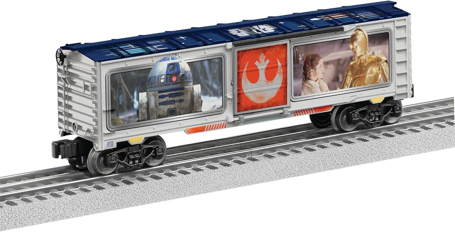 Lionel Disney Star Wars R2-D2 & C-3PO Character O Gauge Model Train Boxcar highlights R2-D2’s & C-3PO’s iconic Star Wars character in progression from one move to the next. Boxcar is compatible with Lionel O Gauge, features die-cast metal trucks, operating couplers, and opening side doors. Recommended for ages 14 years and up.