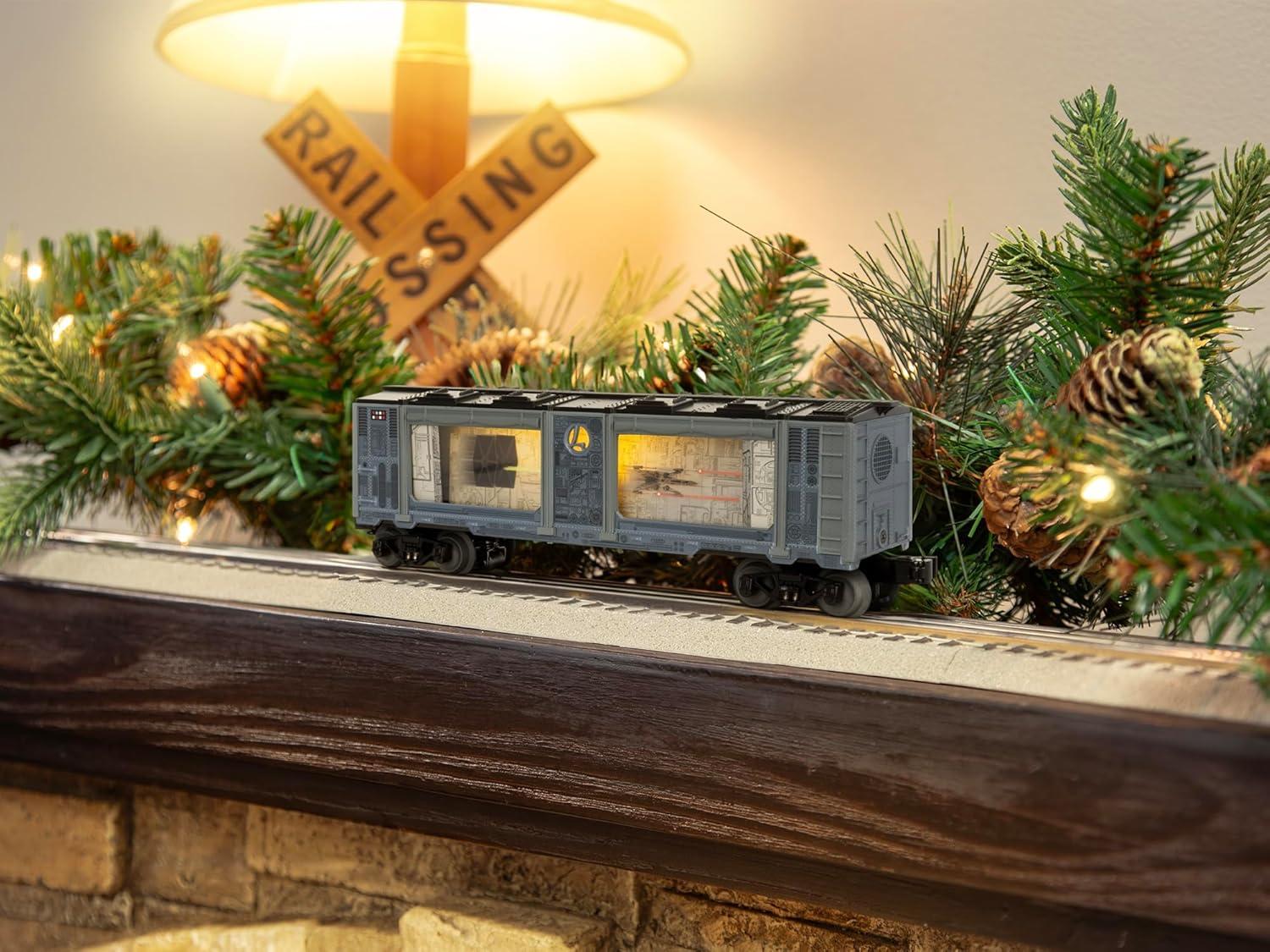 Lionel Disney Star Wars X-Wing / TIE Fighter Battle O Gauge Model Train Aquarium Car highlights a battle between the X-Wing and TIE Fighter through the Death Star Trench around the train car when powered. Car is compatible with Lionel O Gauge and includes a powerful maintenance-free motor with an On Off switch. It features diecast metal trucks, operating couplers, and interior illumination. Recommended for ages 14 years and