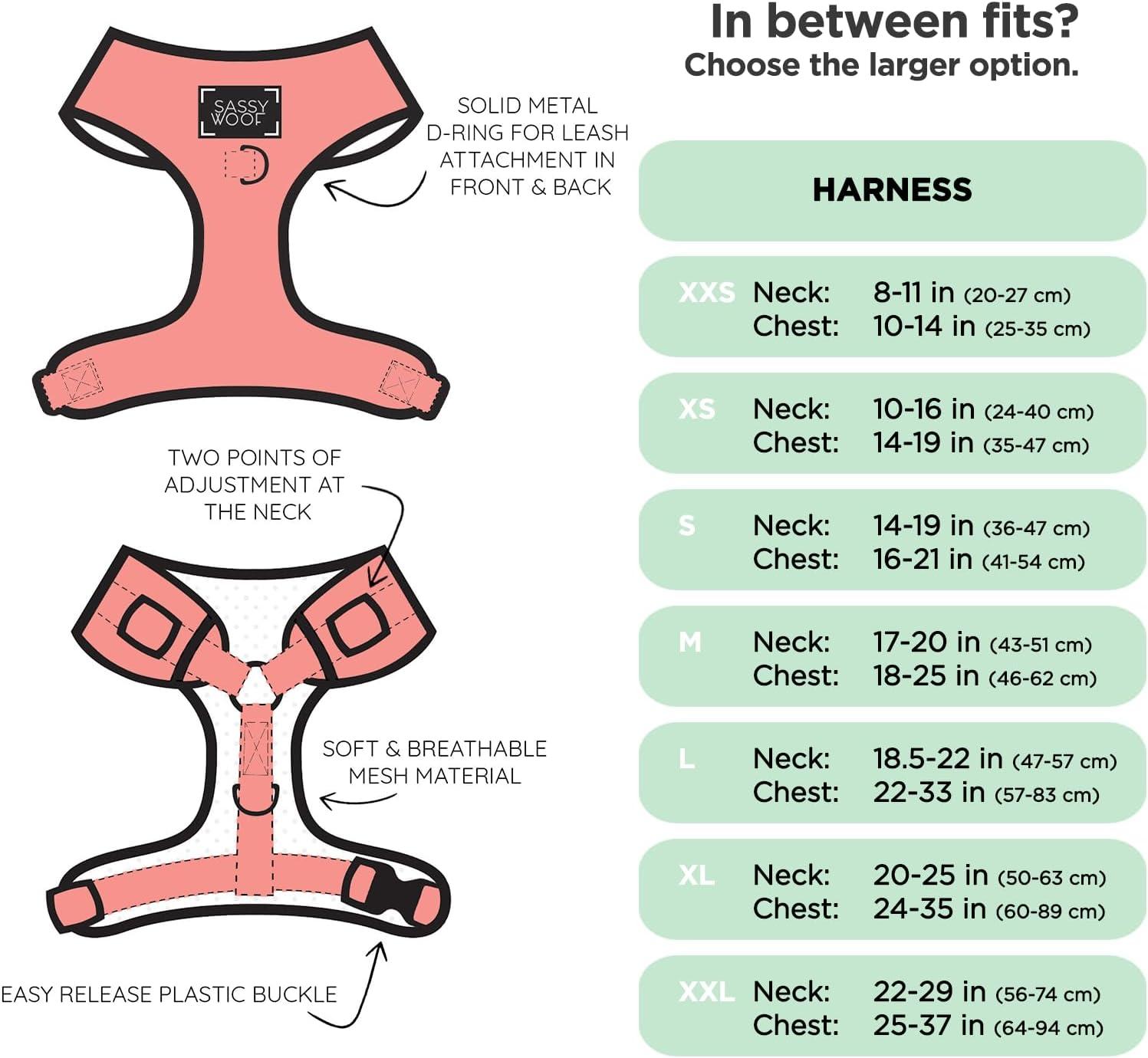 🐾COMPLETE MATCHING SET AVAILABLE: For a coordinated and stylish look, pair this harness with our matching leash, collar and waste bag holder (Available Separately). Each accessory is designed to complement the harness, making your dog the most fashionable pup on the block.
