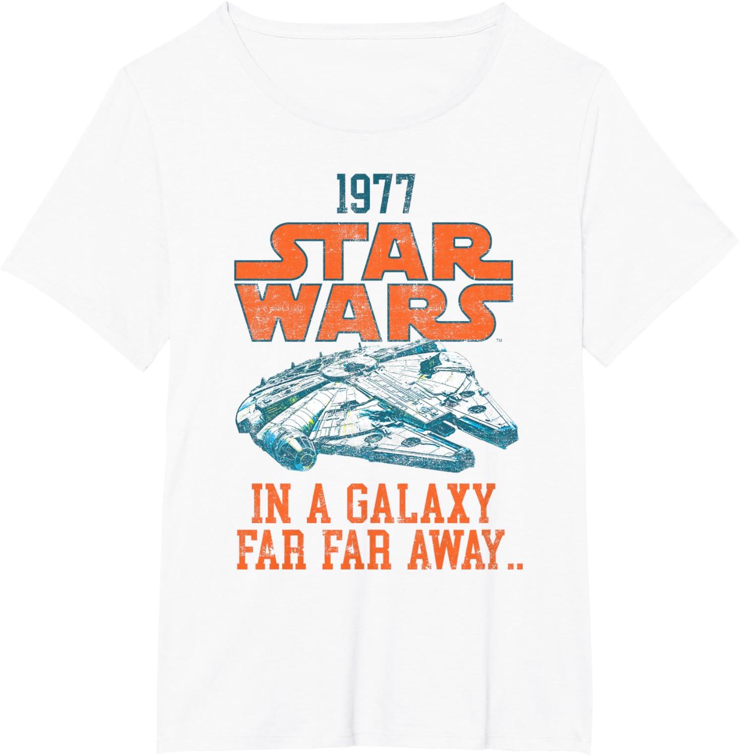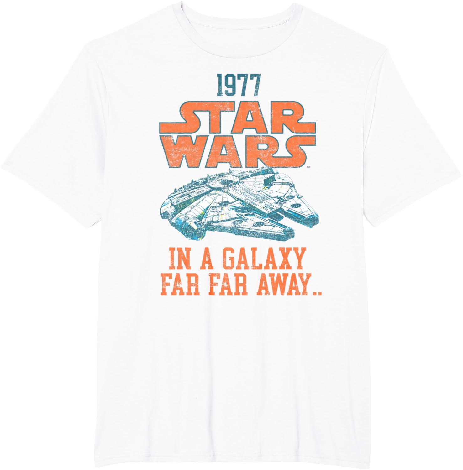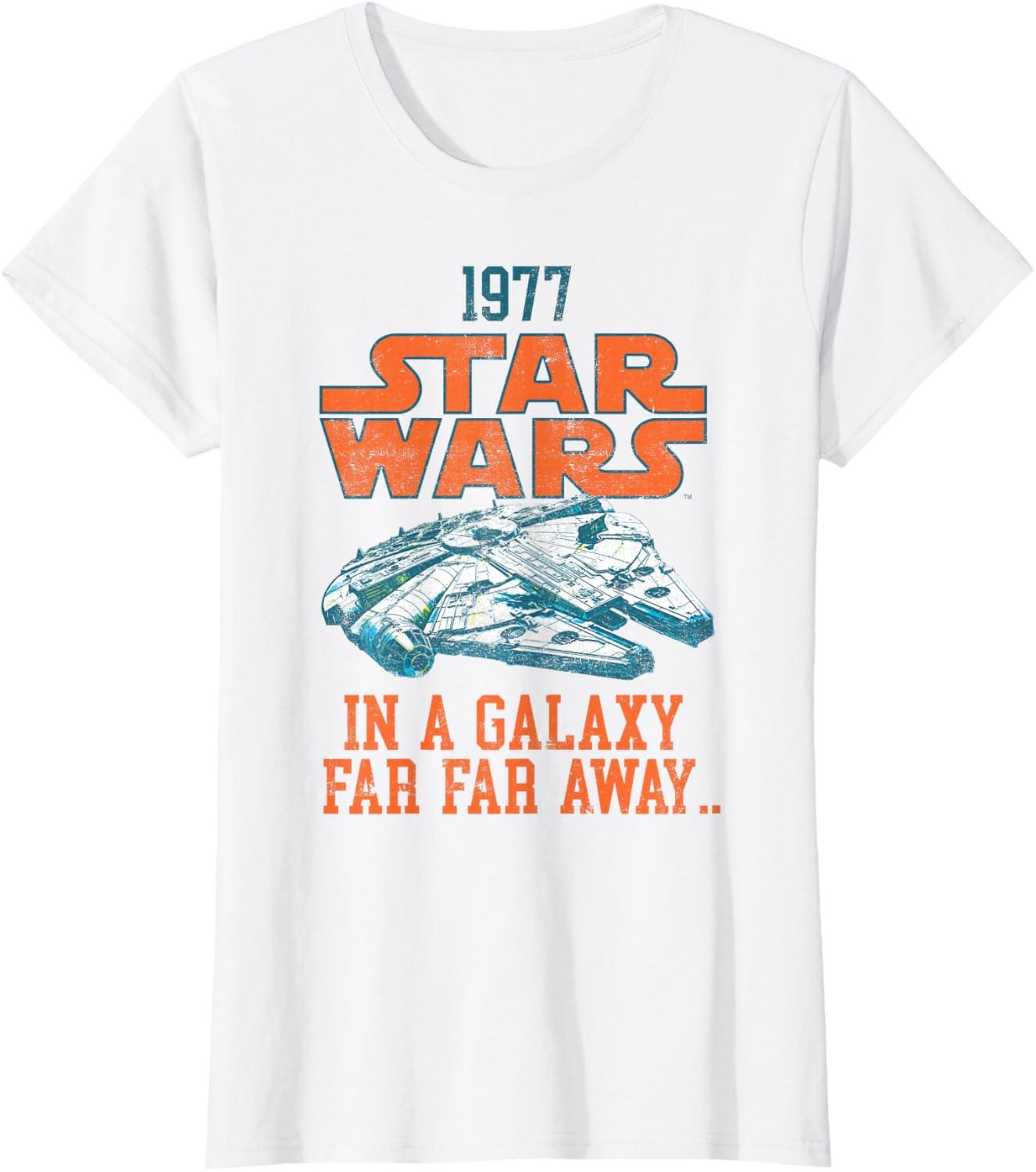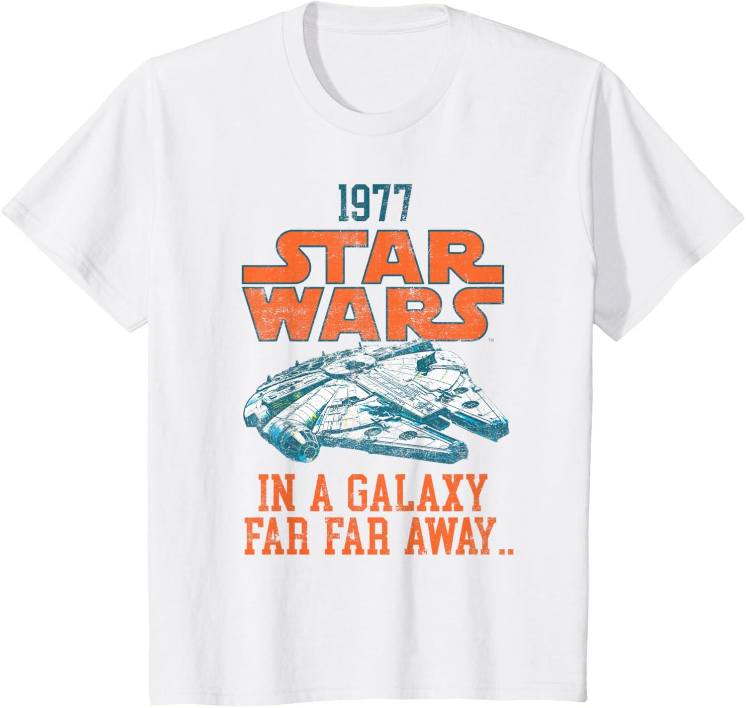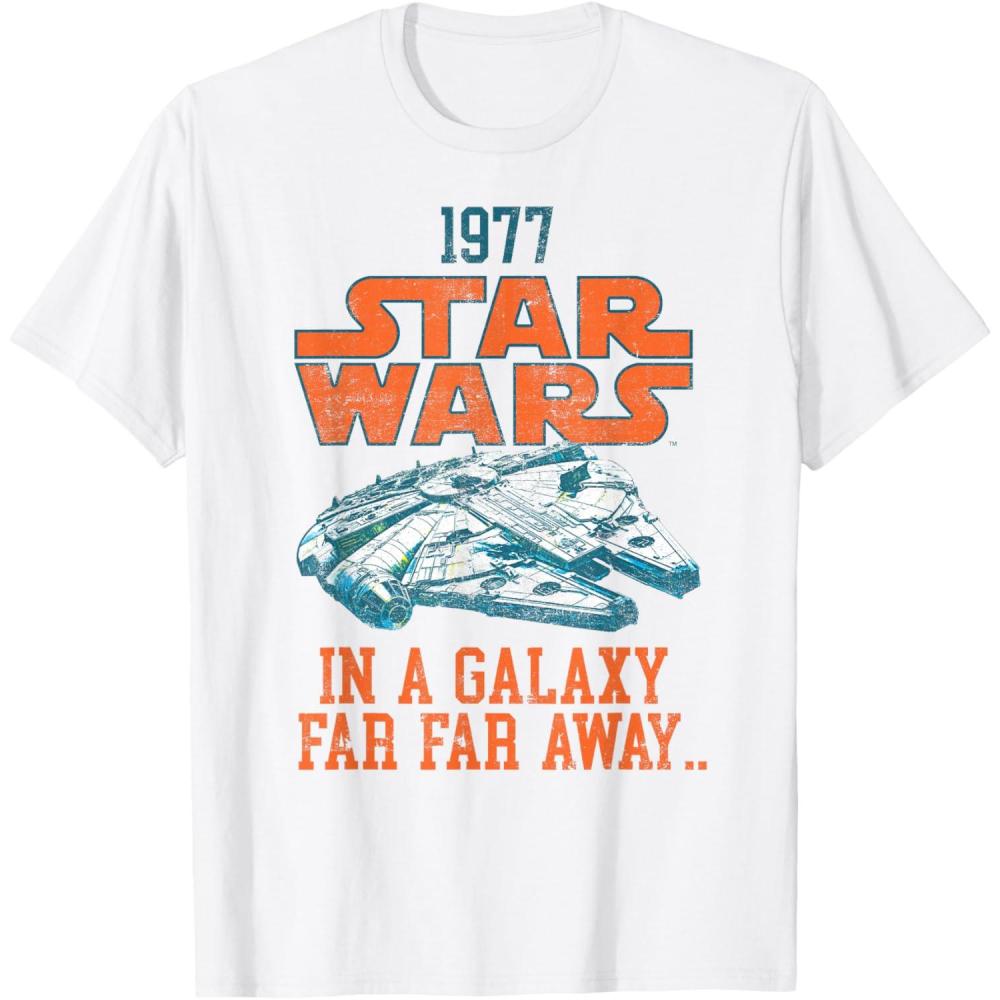 Allow your look to harken back to 1977, when A New Hope hit theaters, with this classic Star Wars t-shirt. Featuring distressed artwork of Han Solo's fastest hunk of junk “In a Galaxy Far, Far Away,” this vintage-inspired Star Wars shirt will delight fans. Planning a trip to Disneyland or Walt Disney World? Get ready for Galaxy's Edge with a Star Wars t-shirt for you or with matching tees for friends and family.