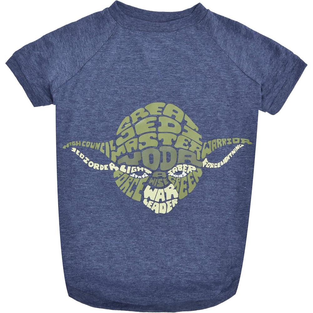 This Star Wars Yoda Wisdom t shirt for dogs is made of a super soft cotton/poly blend, keeping your canine comfortable and ready for adventure. This dark blue dog shirt features your pet's favorite character, Yoda, made up of Star Wars-related words in multiple shades of green. Available in a variety of sizes, this shirt is great for all dogs.