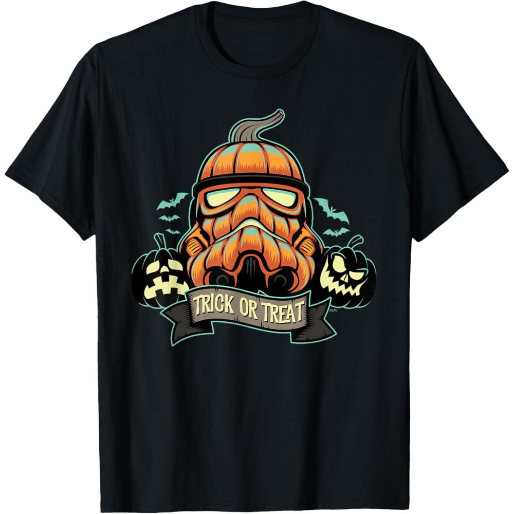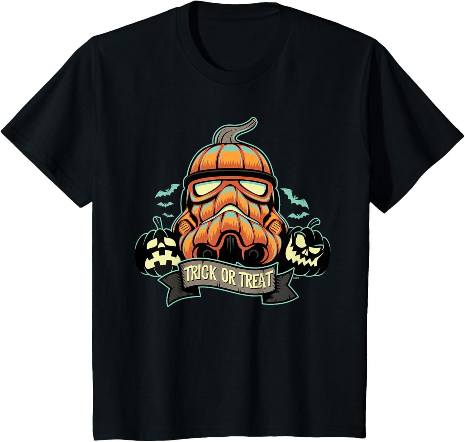 Happy Halloween from a galaxy far, far away! This official Star Wars tee or hoodie features an atmospheric illustration of an Imperial Stormtrooper helmet as a spooky jack-o’-lantern, flanked by shadowy pumpkins and fluttering bats, and with “Trick or Treat” written underneath. A great gift for a Star Wars fan on Halloween or any spooky occasion – add it to a costume, wear it to a Halloween party, or have some trick-or-treating fun! Heading to Disneyland or Walt Disney World? Get ready for Galaxy’s Edge with a Star Wars tee that’s perfect for coordinating and matching up with friends and family. Available in youth and adult sizes. Find it in a t-shirt, premium t-shirt, tank top, v-neck, long sleeve tee, hoodie, and sweatshirt.