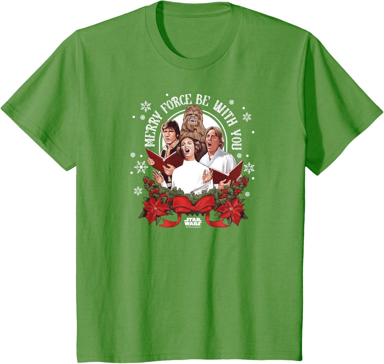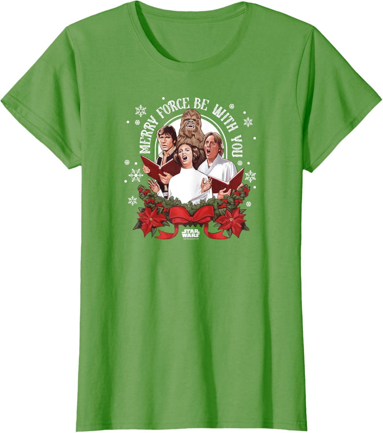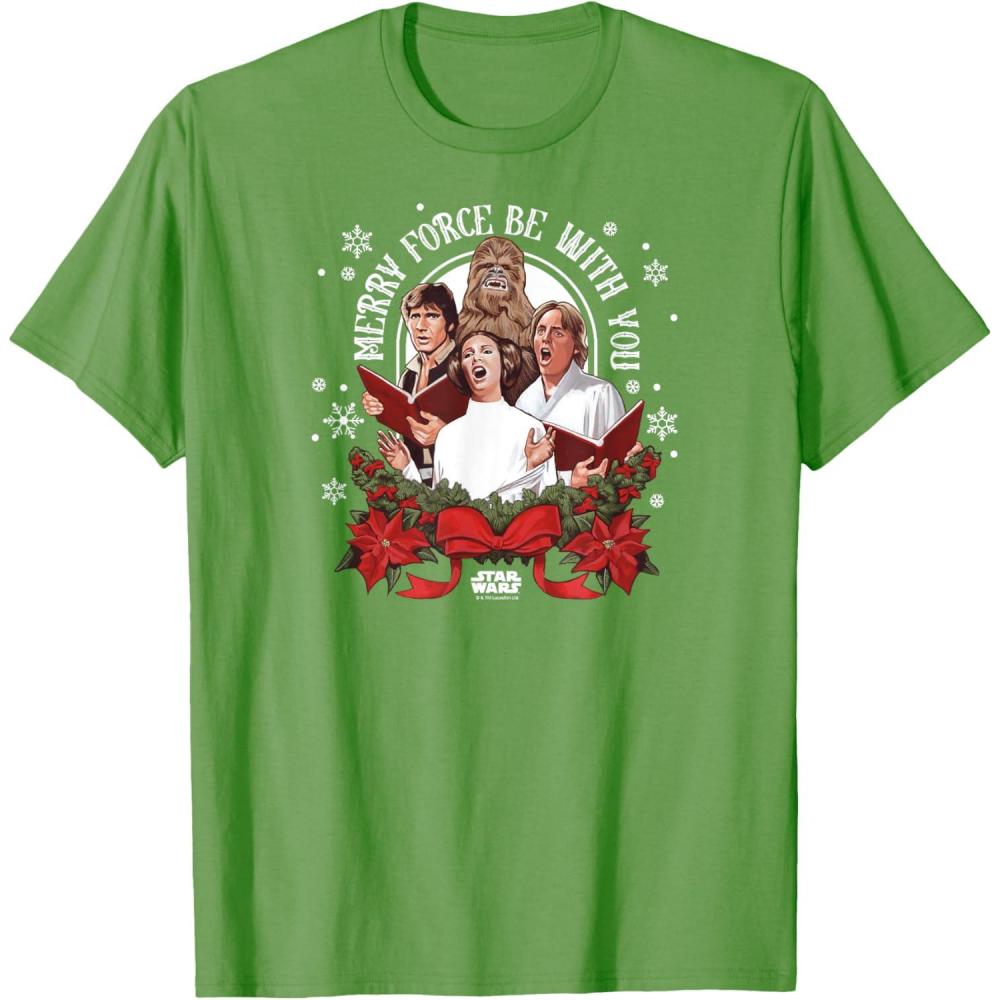 Ring in the holidays with galactic harmony in this heartwarming Star Wars design featuring Leia Han Luke and Chewbacca singing in festive style. Wrapped in a wreath of poinsettias and holly with snowflakes falling all around this scene is a joyful tribute to the Rebel Alliance. With the cheerful message Merry Force Be With You this design blends holiday spirit and classic Star Wars magic making it a seasonal must have for fans across the galaxy.
