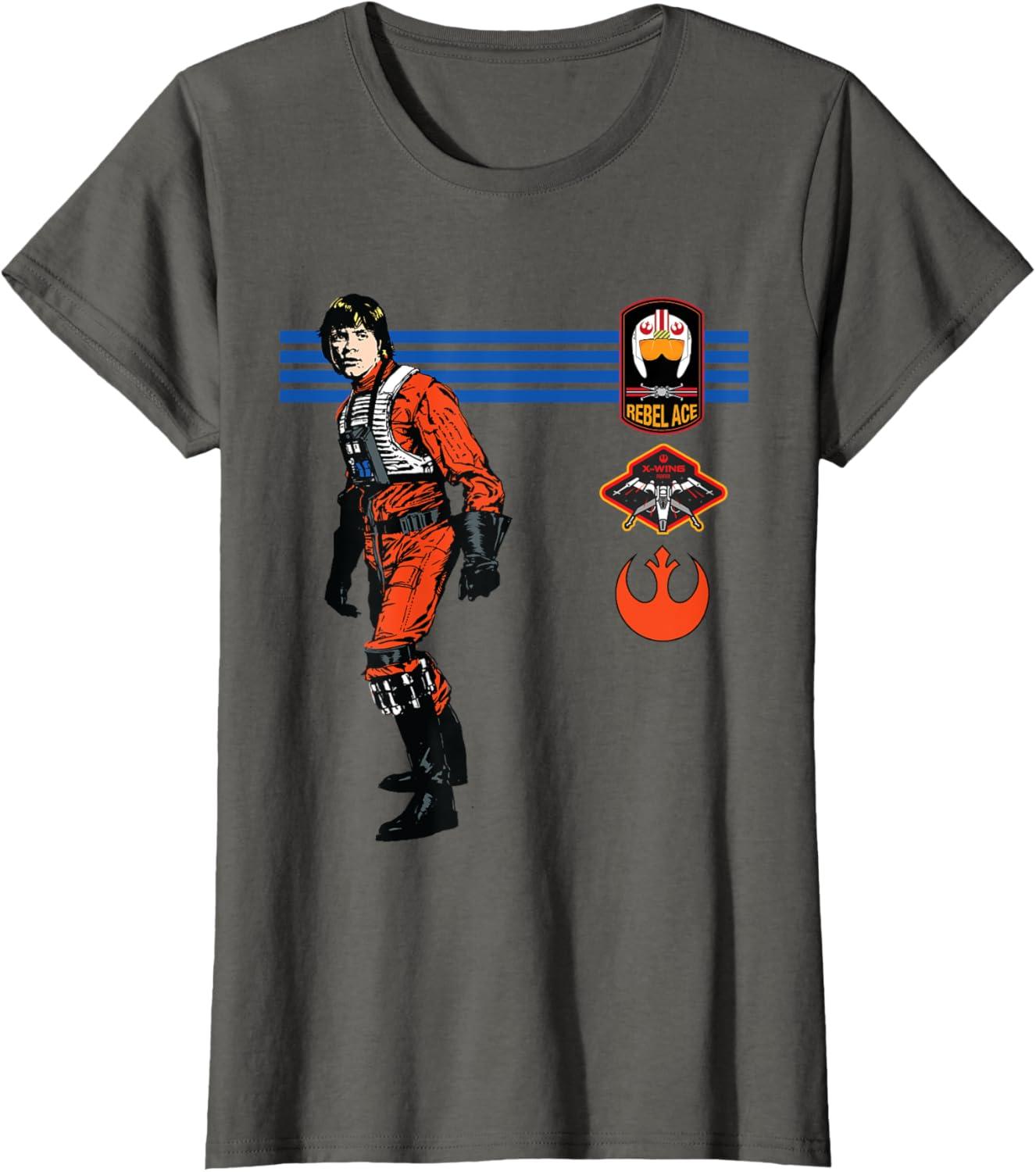 Don your favorite Rebel starfighter, Luke Skywalker, with this retro graphic tee shirt of the young rebel pilot in his orange jumpsuit. It features 70s-style stripes and a row of retro icons that include Rebel Alliance, X-Wing Fighter, and Rebel Ace symbols. If you're searching for the perfect gift for Star Wars fans, this t-shirt is it.