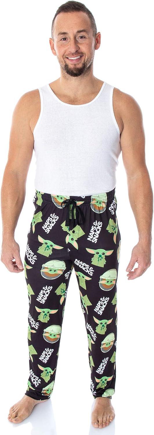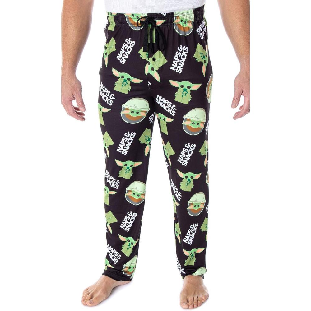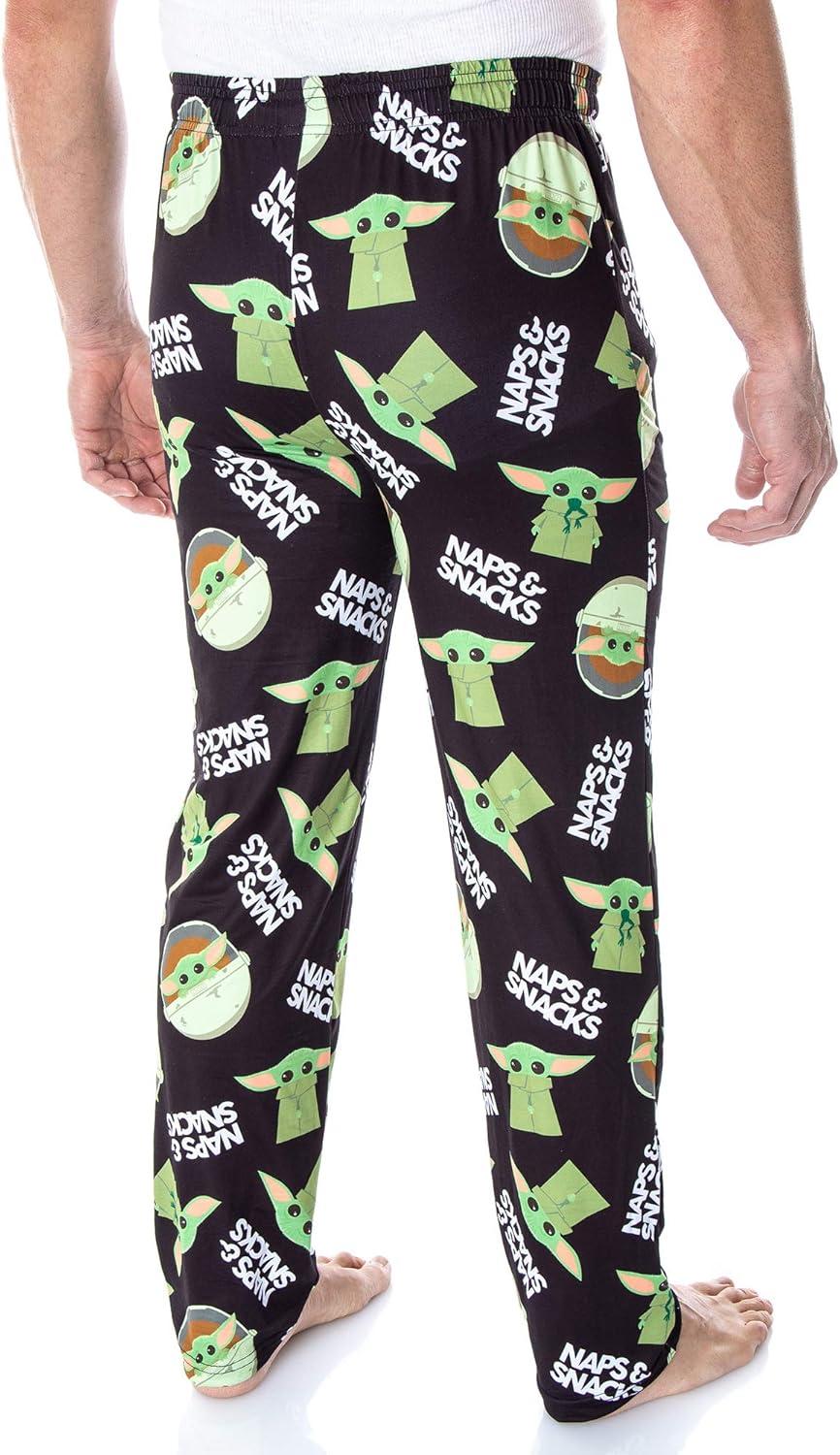 These are Star Wars / Disney Star Lounge pants! One of the newest and instantly adored characters in the Star Wars universe is a cute little guy known as The Child, aka Baby Yoda! These Star Wars adult lounge pants are extremely great with a new fabric blend style. The Baby Yoda pajama pants feature an allover design of The Child in his floating basket and him snacking on a frog. like many of us, he loves snacks and naps! It is made of a wonderful 92% polyester / 8% spandex fabric blend and has a drawstring waist closure and dual front pockets.