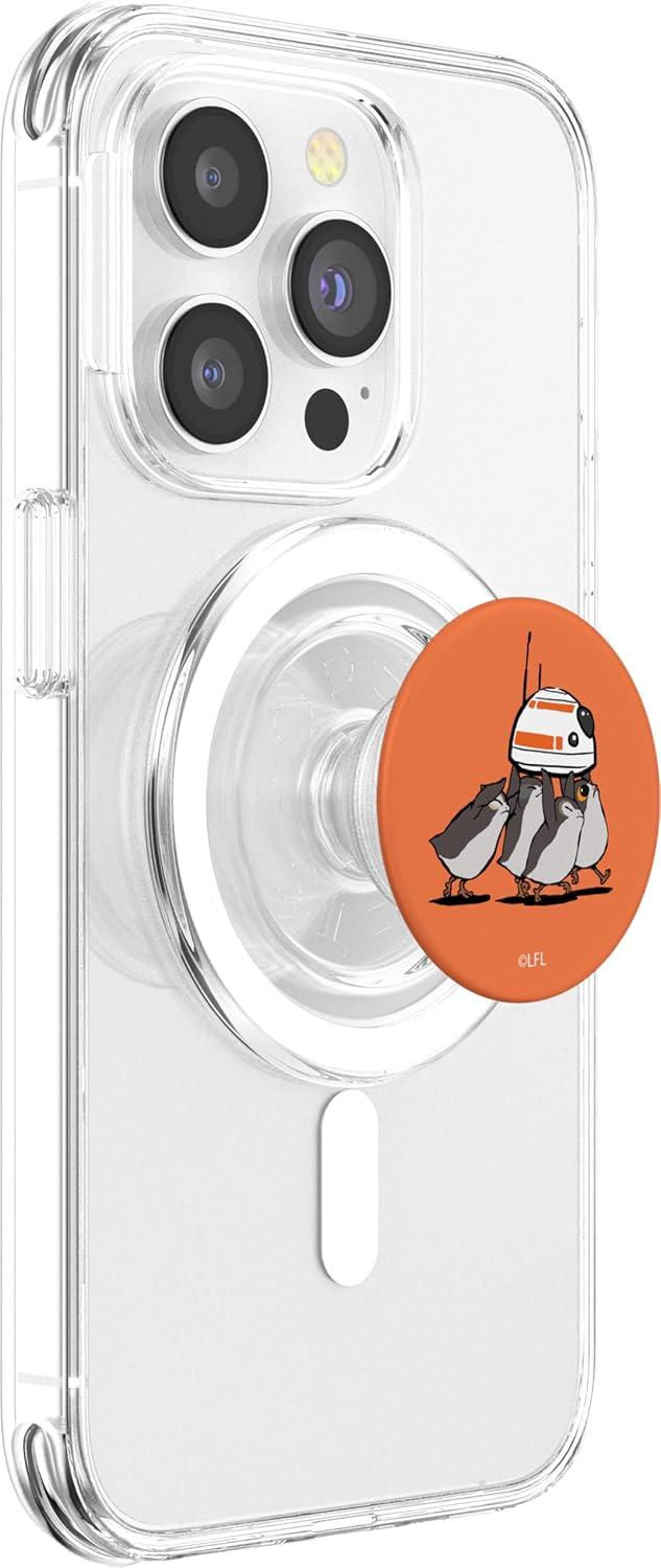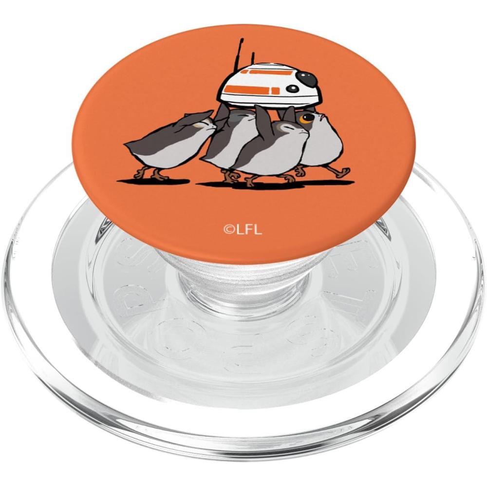 With a charming cartoon showcasing Porgs carrying the top half of BB-8, this cute Star Wars phone accessory featuring the curious little creatures seen in The Last Jedi against an orange background will inspire a flock of compliments. Stick this Star Wars pop up grip to the back of your phone or tablet for a handle when taking selfies or a stand for watching videos.
