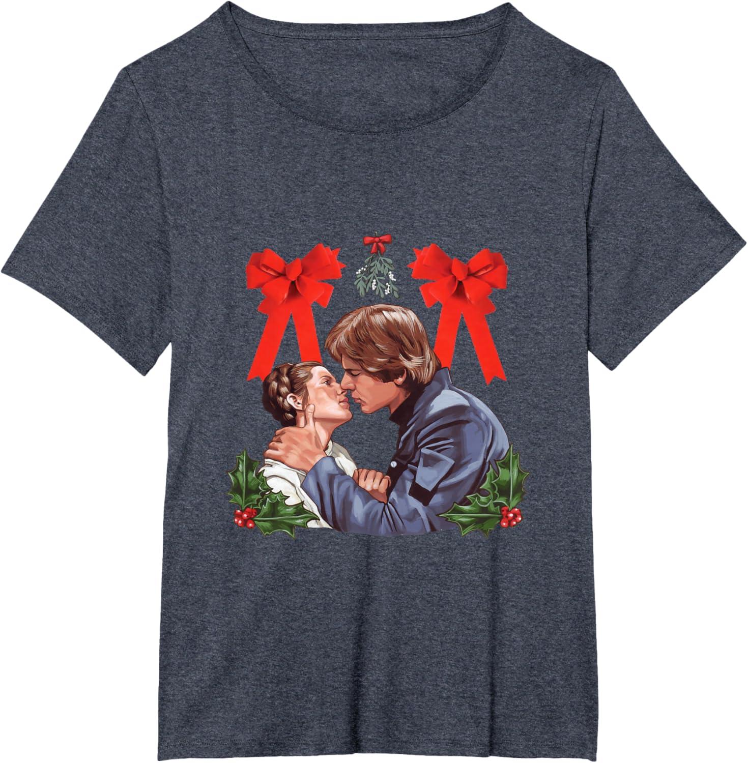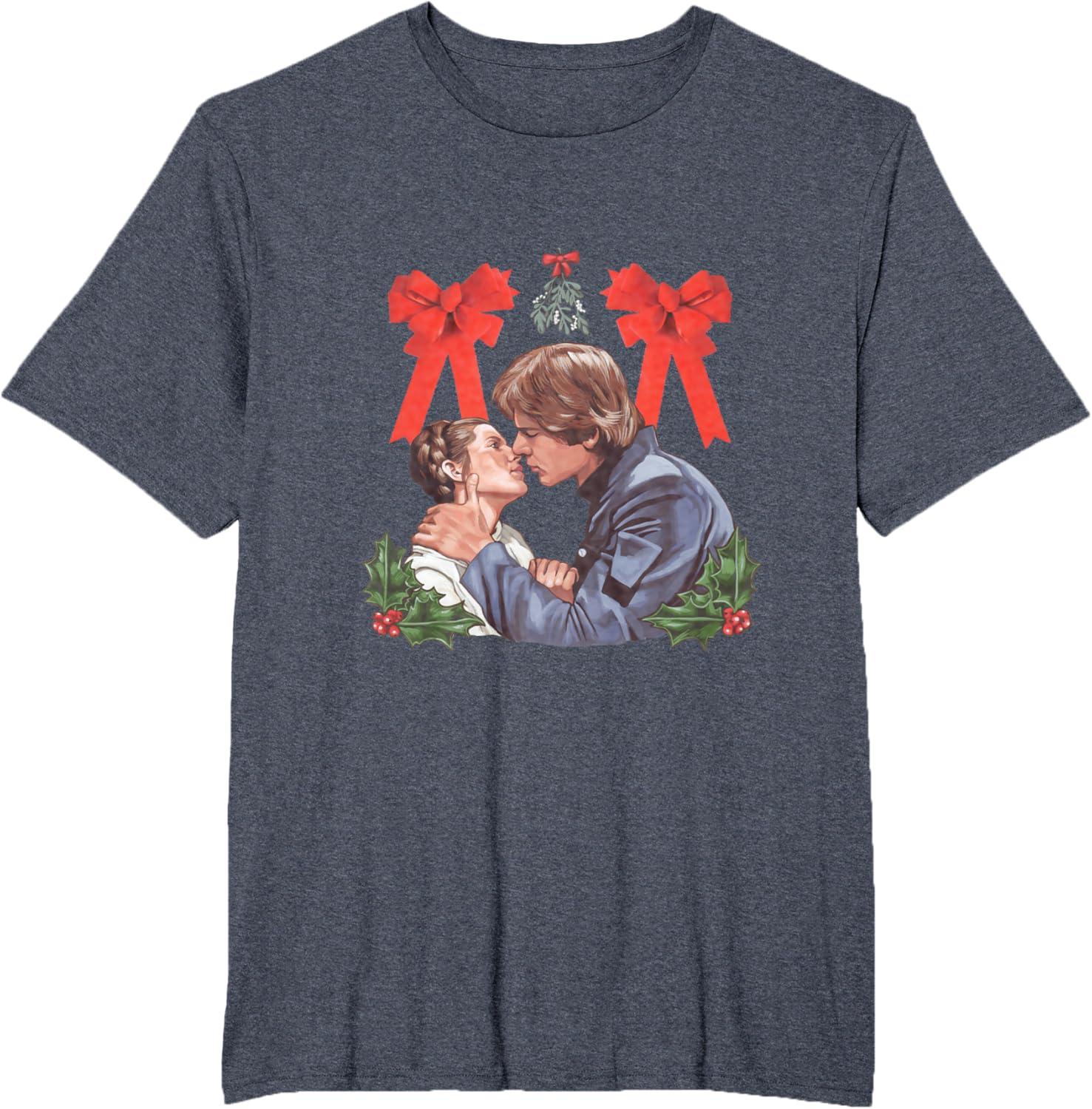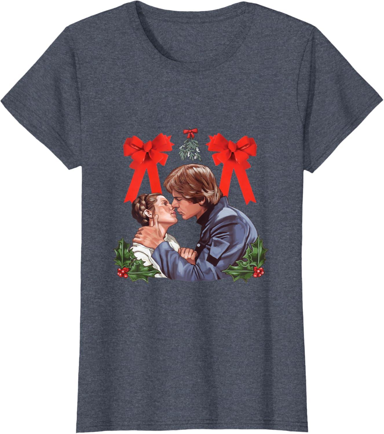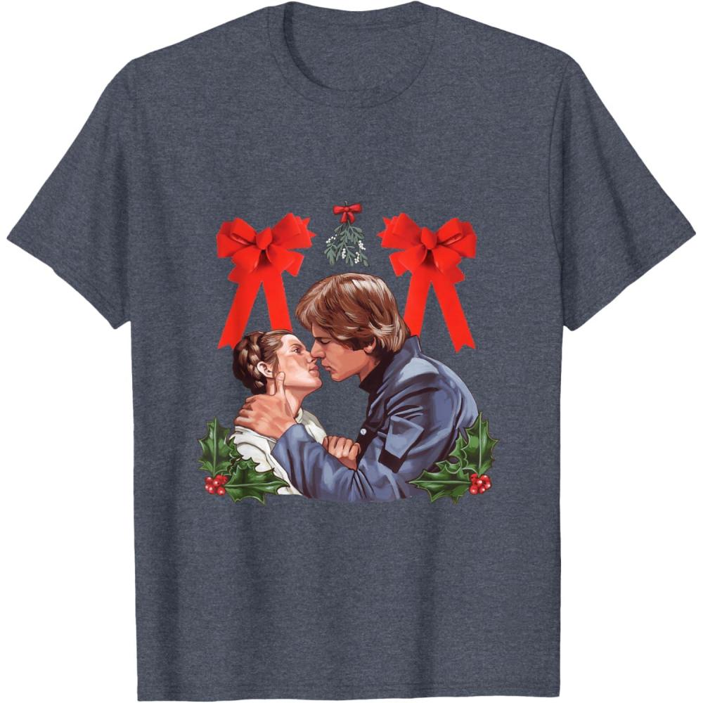 Star Wars Princess Leia Han Solo Mistletoe Kiss Holiday T-Shirt(Heather Blue)