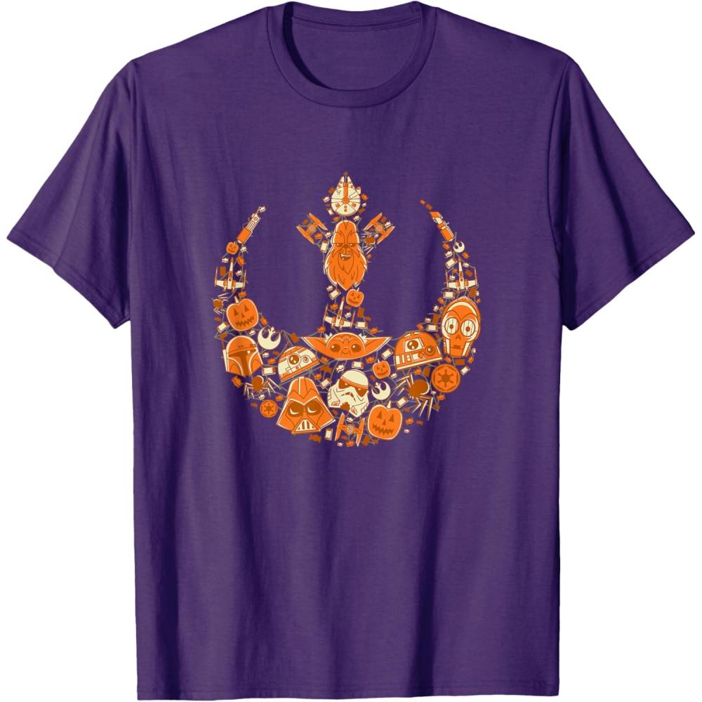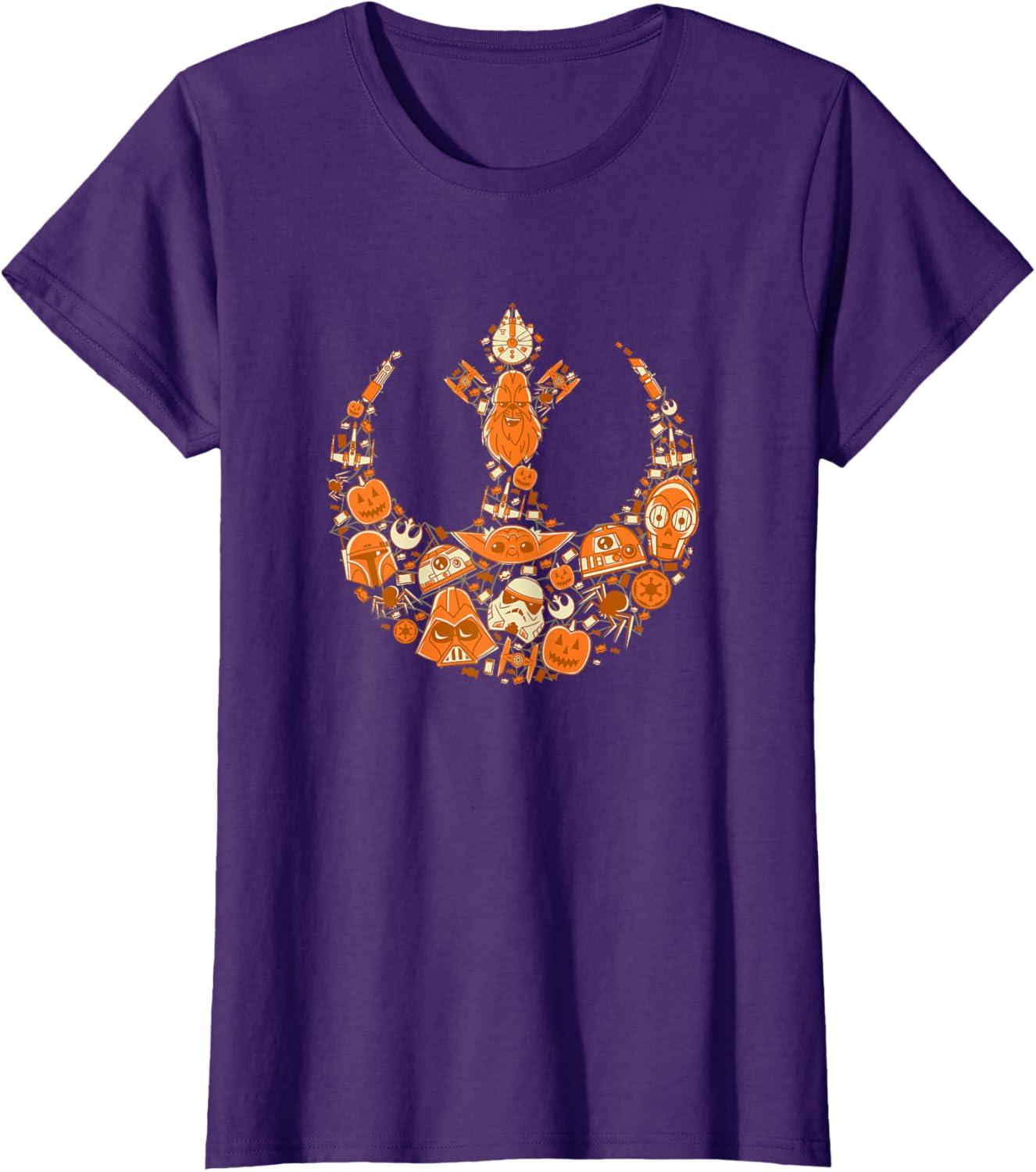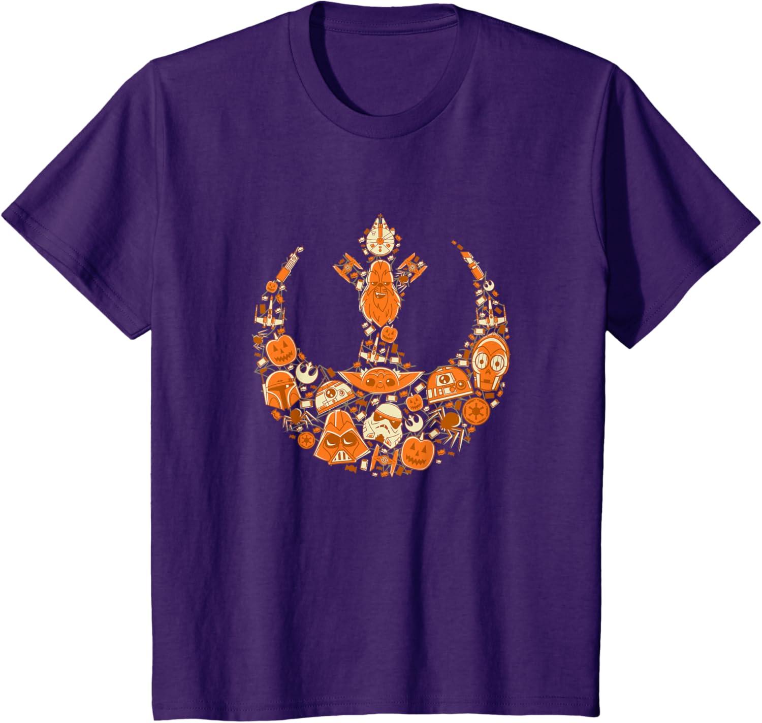 Celebrate the spooky season in a galaxy far, far away with this festive Star Wars Halloween t-shirt. The Rebel Alliance logo gets a themed update on this Halloween tee showcasing a candy-colored design that blends jack-o’-lanterns, spiders, and Halloween candy with some of your favorite galactic characters. Look closely, and you’ll spot Boba Fett, Stormtroopers, Darth Vader, Chewbacca, C-3PO, R2-D2, Grogu (sometimes referred to as Baby Yoda), BB-8, TIE Fighters, X-Wing Starfighters, lightsabers and more. Planning a trip to Disneyland or Walt Disney World? Get ready for Galaxy’s Edge with a cool tee for you or matching t-shirts for friends and family. Available in youth and adult sizes. Get it in a t-shirt, premium t-shirt, tank top, v-neck, long sleeve, and sweatshirt.