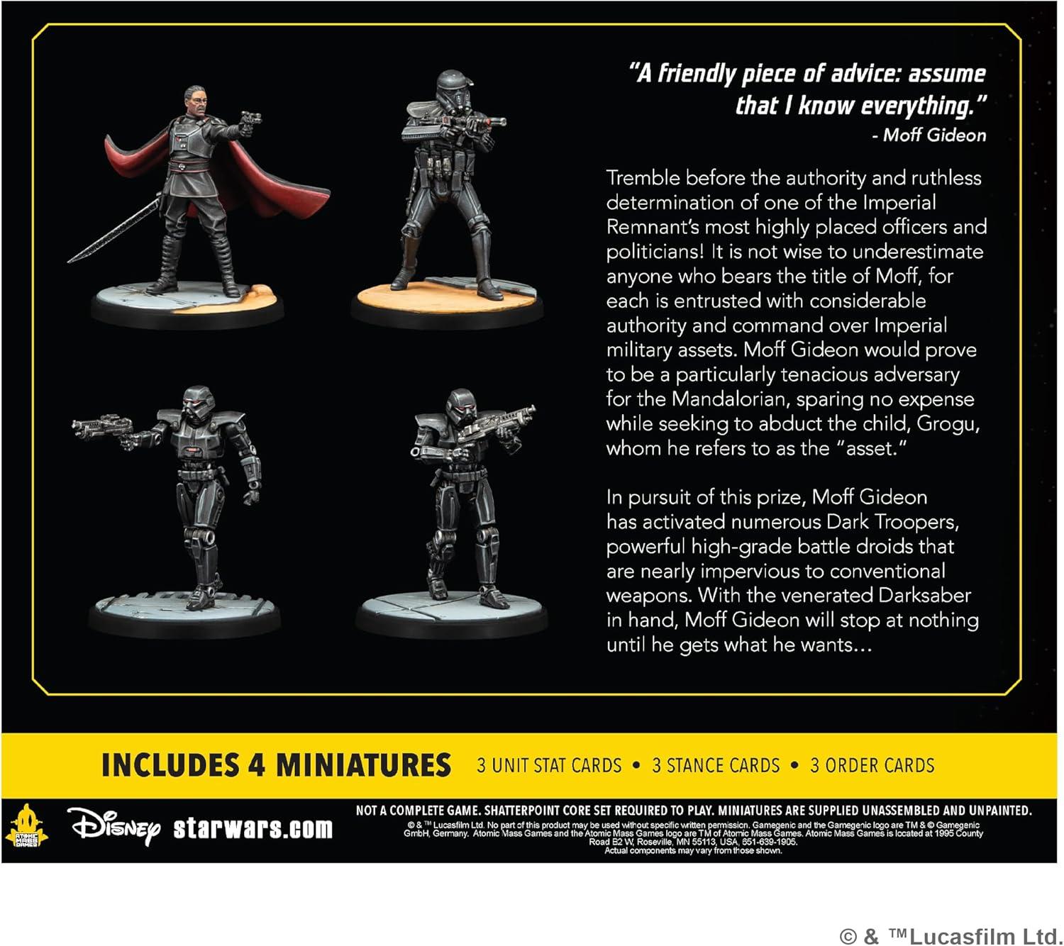 The Empire lives on this new Squad Pack for Star Wars™: Shatterpoint! This pack brings the cunning Moff Gideon to the game as a Primary Unit. He is joined by a Death Trooper Escort as a Secondary Unit and two terrifying Dark Troopers as a Supporting Unit. Together, they form an intimidating Galactic Civil War-era squad ready to be deployed. Alternatively, they can be combined with other units from this era to form a custom squad. Rounding out this pack are all the Stat, Stance, and Order cards players need to field them in battle.