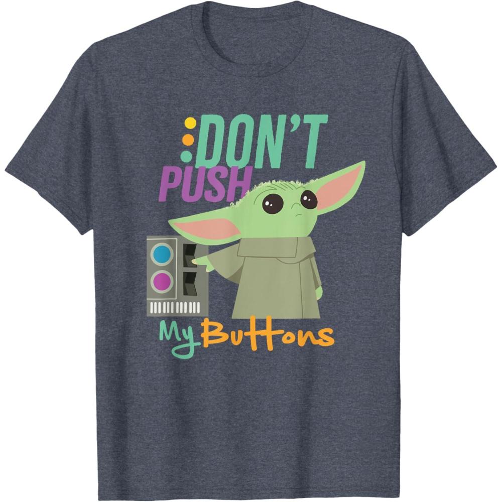You won't need to use the Force to let the galaxy know how you feel when wearing this funny Mandalorian shirt starring the Child. It features vibrant pops of color and a stylized illustration of the cutest creature in the galaxy with “Don't Push My Buttons.” Let them all be warned. While he may look like a Baby Yoda, this lovable creature is referred to as The Child or Grogu. With artwork from the hit series, Star Wars: The Mandalorian, now streaming on Disney+. Available in youth and adult sizes. Get it in a t-shirt, premium t-shirt, tank top, V-neck, long sleeve tee, sweatshirt, or pullover hoodie right here on Amazon.