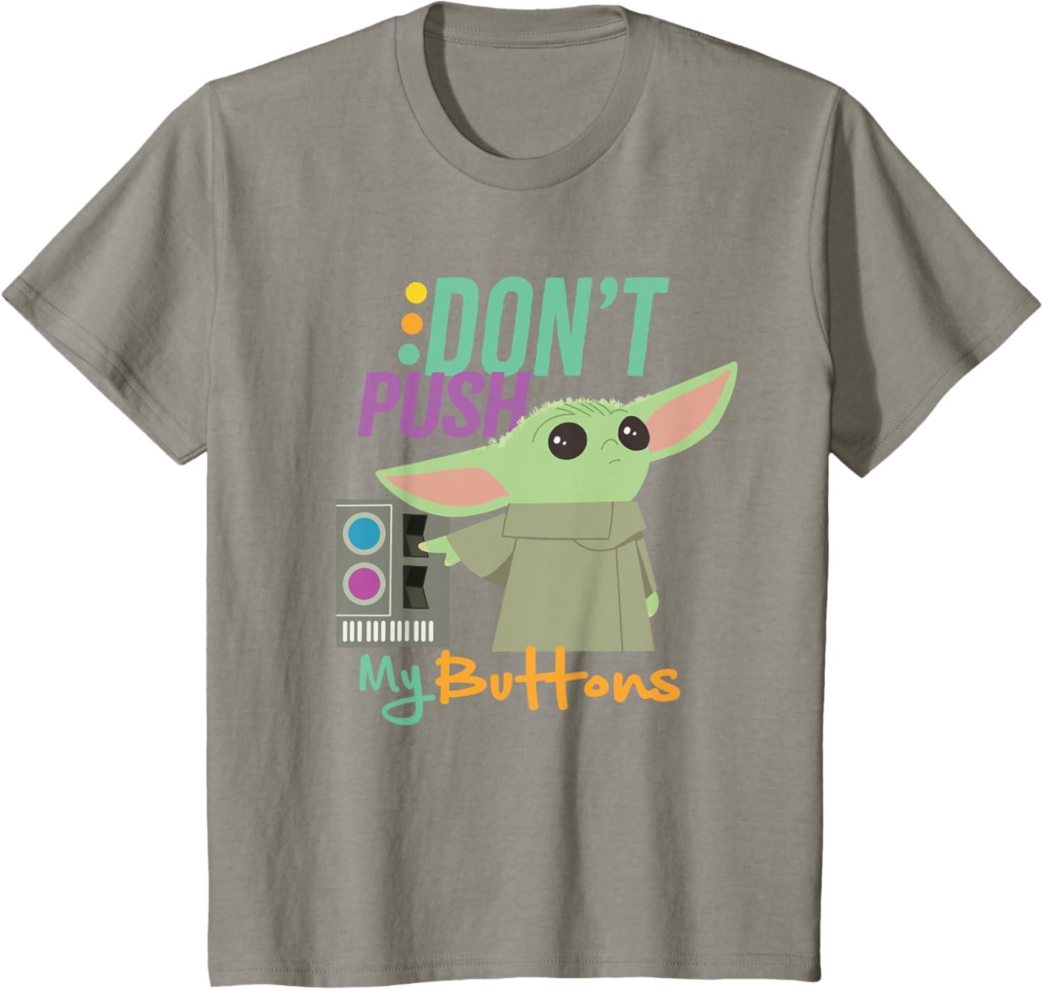 You won't need to use the Force to let the galaxy know how you feel when wearing this funny Mandalorian shirt starring the Child. It features vibrant pops of color and a stylized illustration of the cutest creature in the galaxy with “Don't Push My Buttons.” Let them all be warned. While he may look like a Baby Yoda, this lovable creature is referred to as The Child or Grogu. With artwork from the hit series, Star Wars: The Mandalorian, now streaming on Disney+. Available in youth and adult sizes. Get it in a t-shirt, premium t-shirt, tank top, V-neck, long sleeve tee, sweatshirt, or pullover hoodie right here on Amazon.