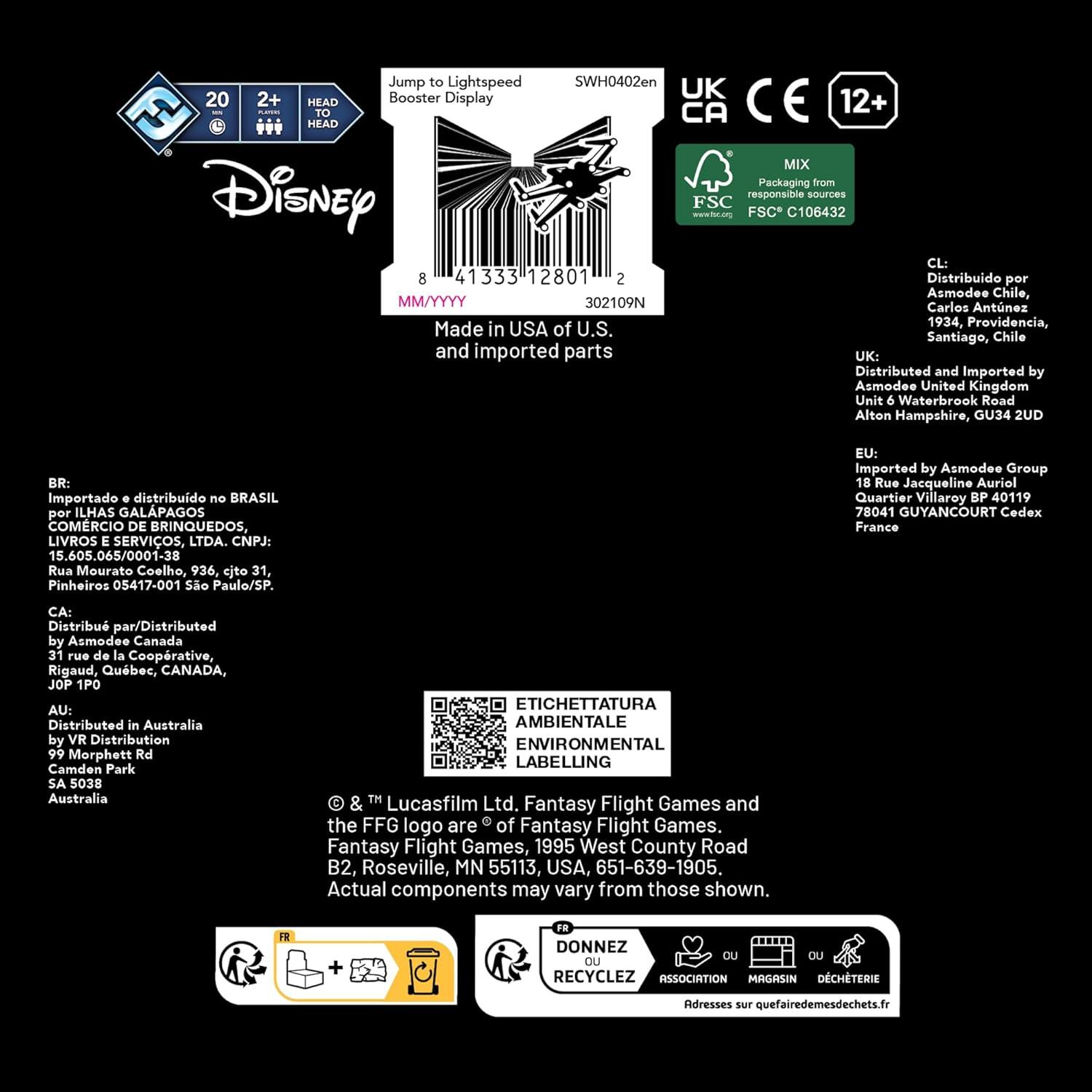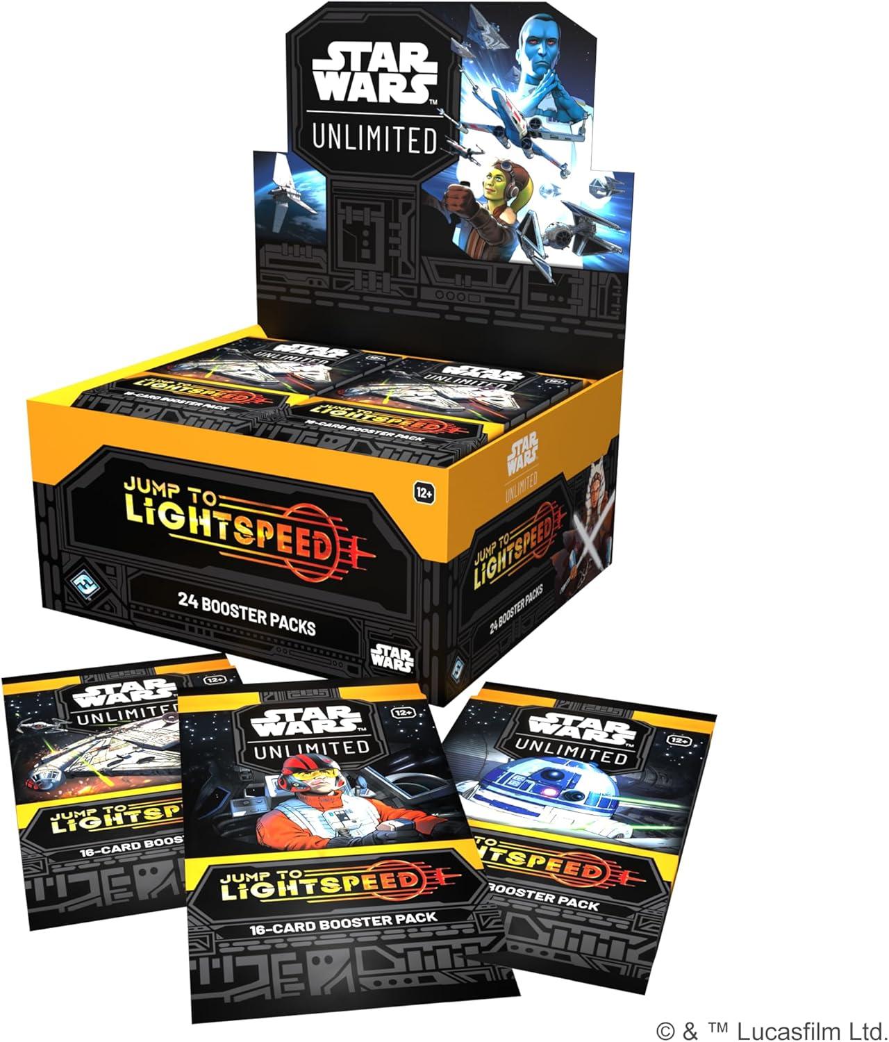 Enter a galaxy of endless possibilities in Star Wars™: Unlimited! In this fast-paced, easy-to-learn trading card game, you and your opponent face off in exciting head-to-head battles full of iconic Star Wars characters. In this booster pack display for the game’s fourth set, Jump to Lightspeed, you’ll find 24 individually wrapped booster packs. Each pack contains 9 common cards, 3 uncommon cards, 1 rare or legendary card, 1 leader, 1 base/token, and 1 foil card. The Jump to Lightspeed set features characters and content from multiple eras in the Star Wars galaxy, with a particular focus on epic space battles.