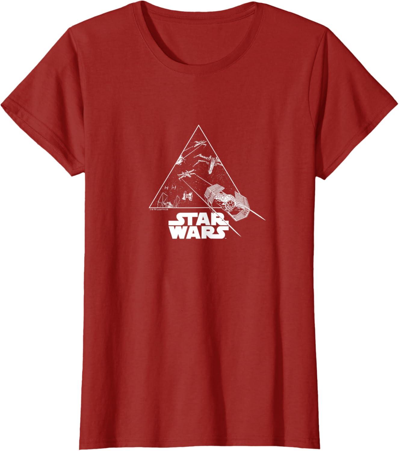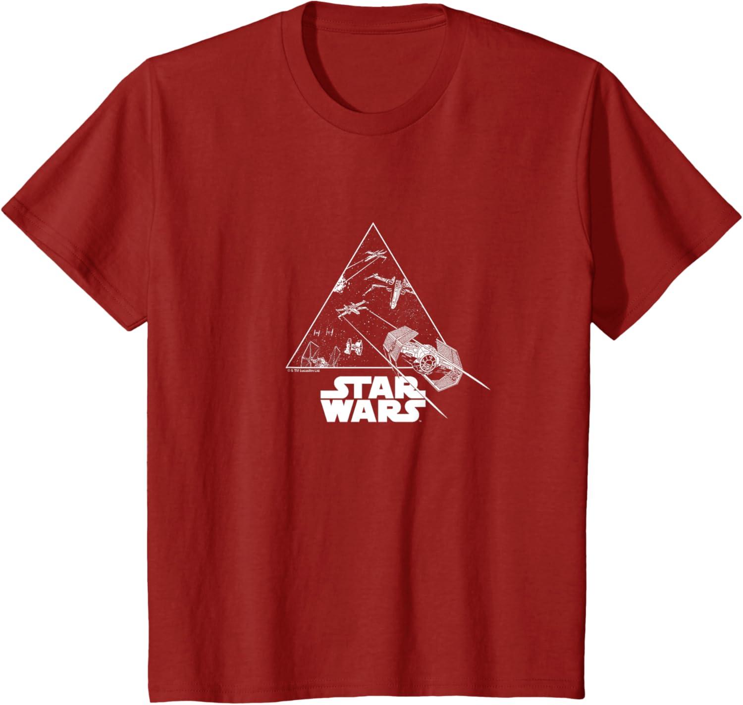 This bold black-and-white Star Wars design captures a high-stakes space battle in a striking triangular frame. X-Wings and TIE Fighters clash across a star-speckled galaxy, with laser blasts and motion lines creating a sense of speed and chaos. The dramatic monochrome palette gives it a graphic novel vibe, while the angular composition adds modern edge. A large TIE Fighter bursts beyond the triangle’s edge, blending retro sci-fi flair with sleek, minimalist style. A must for space combat fans.