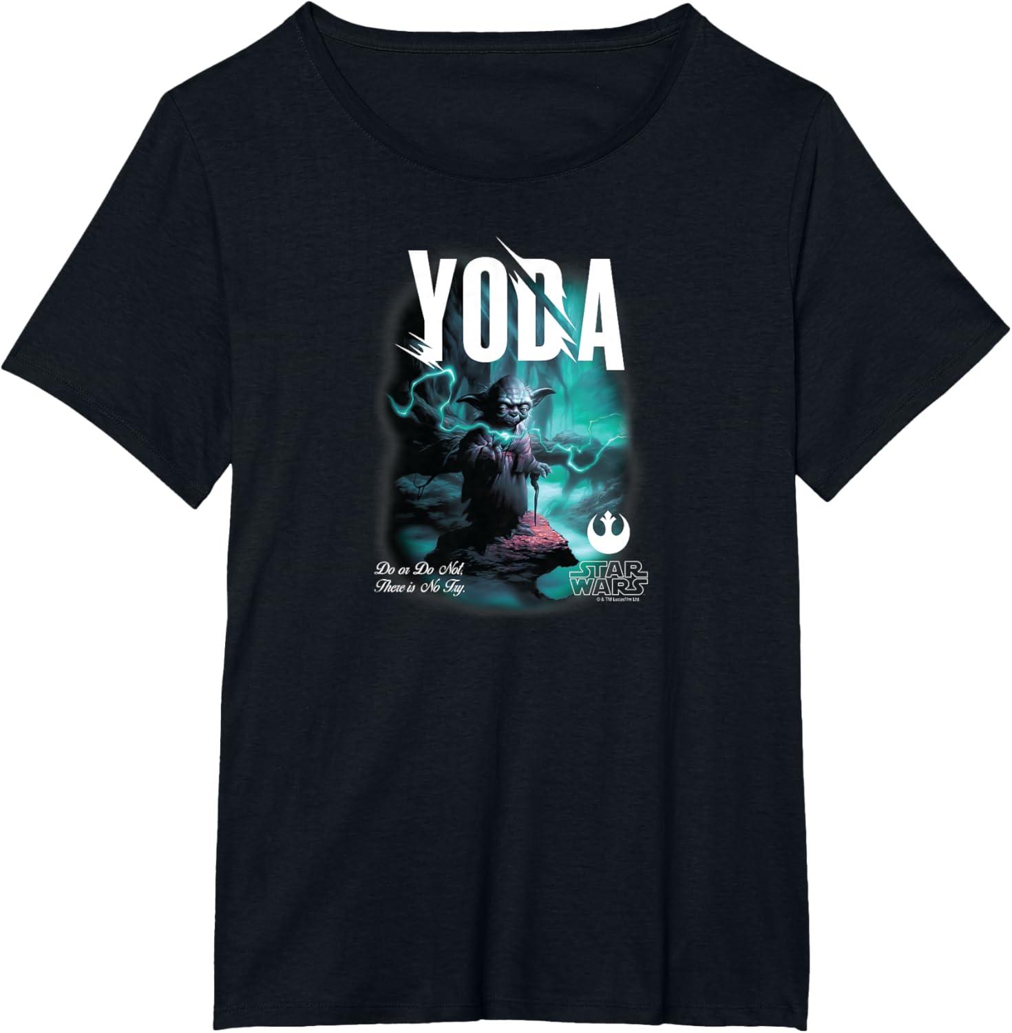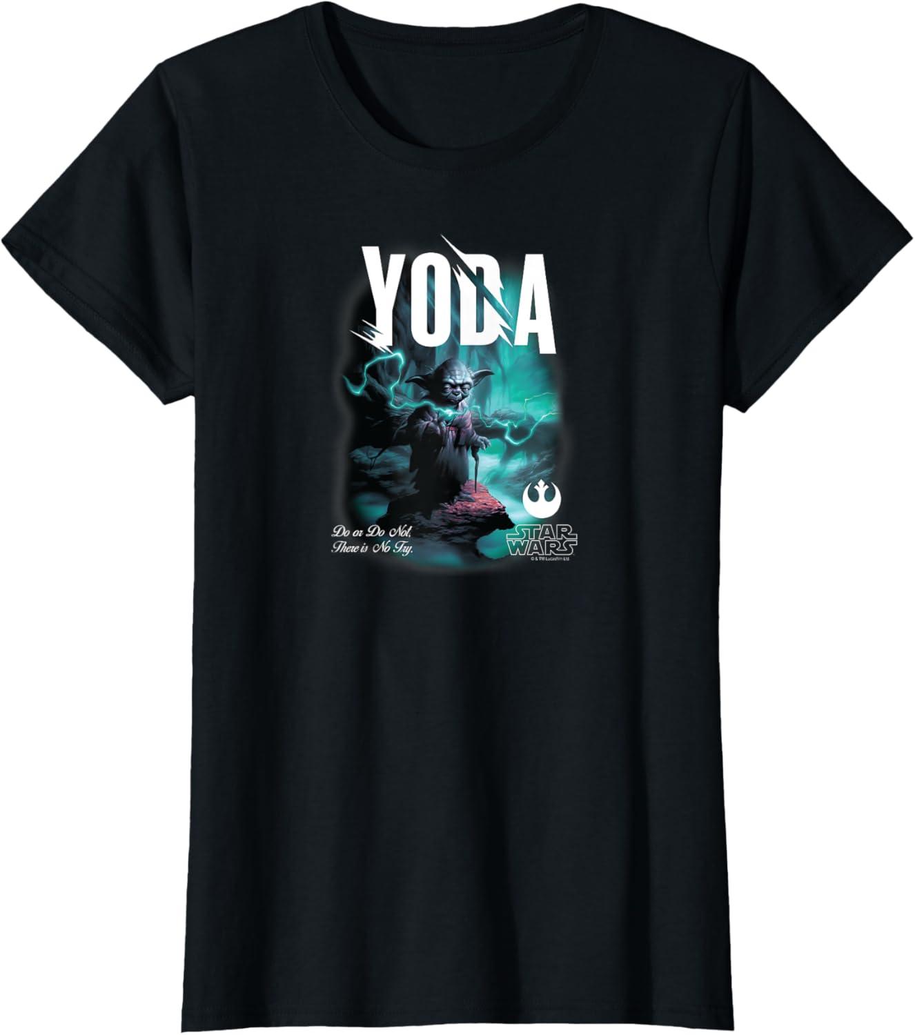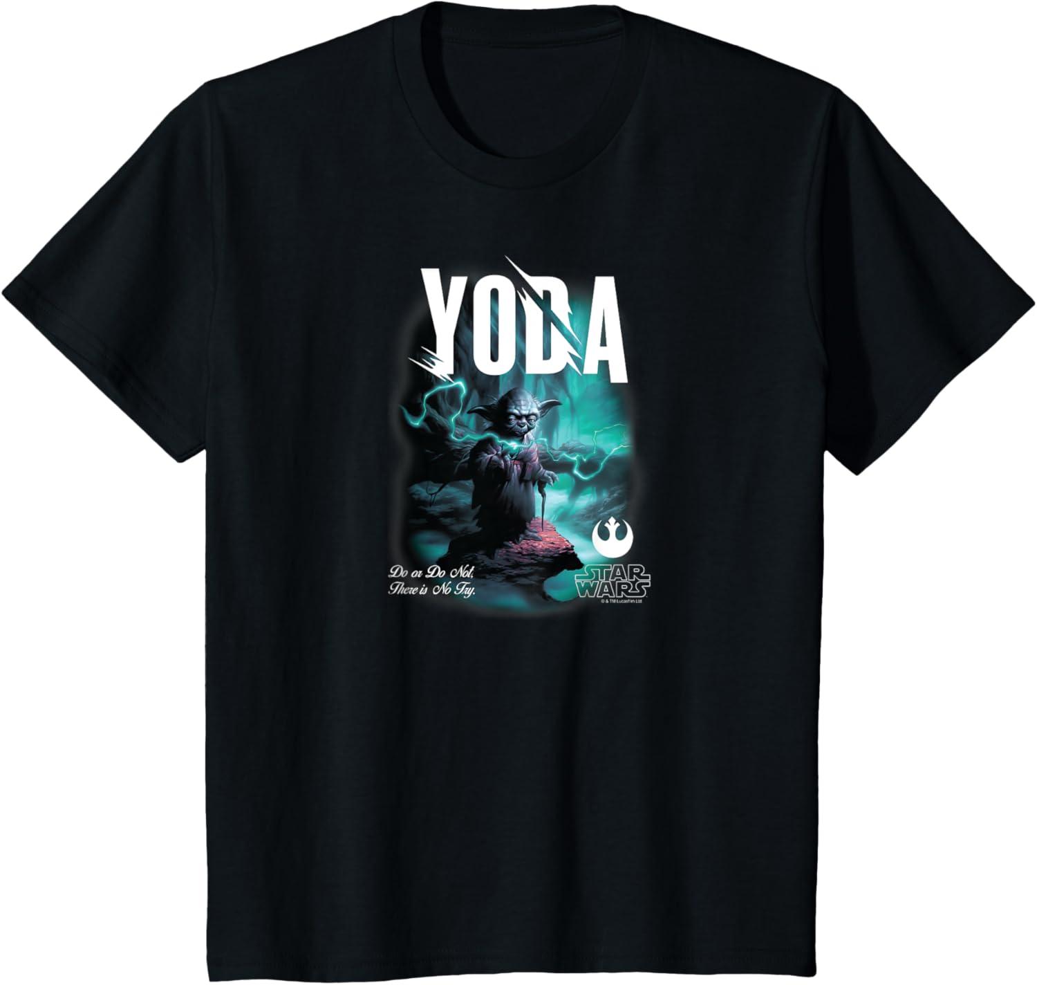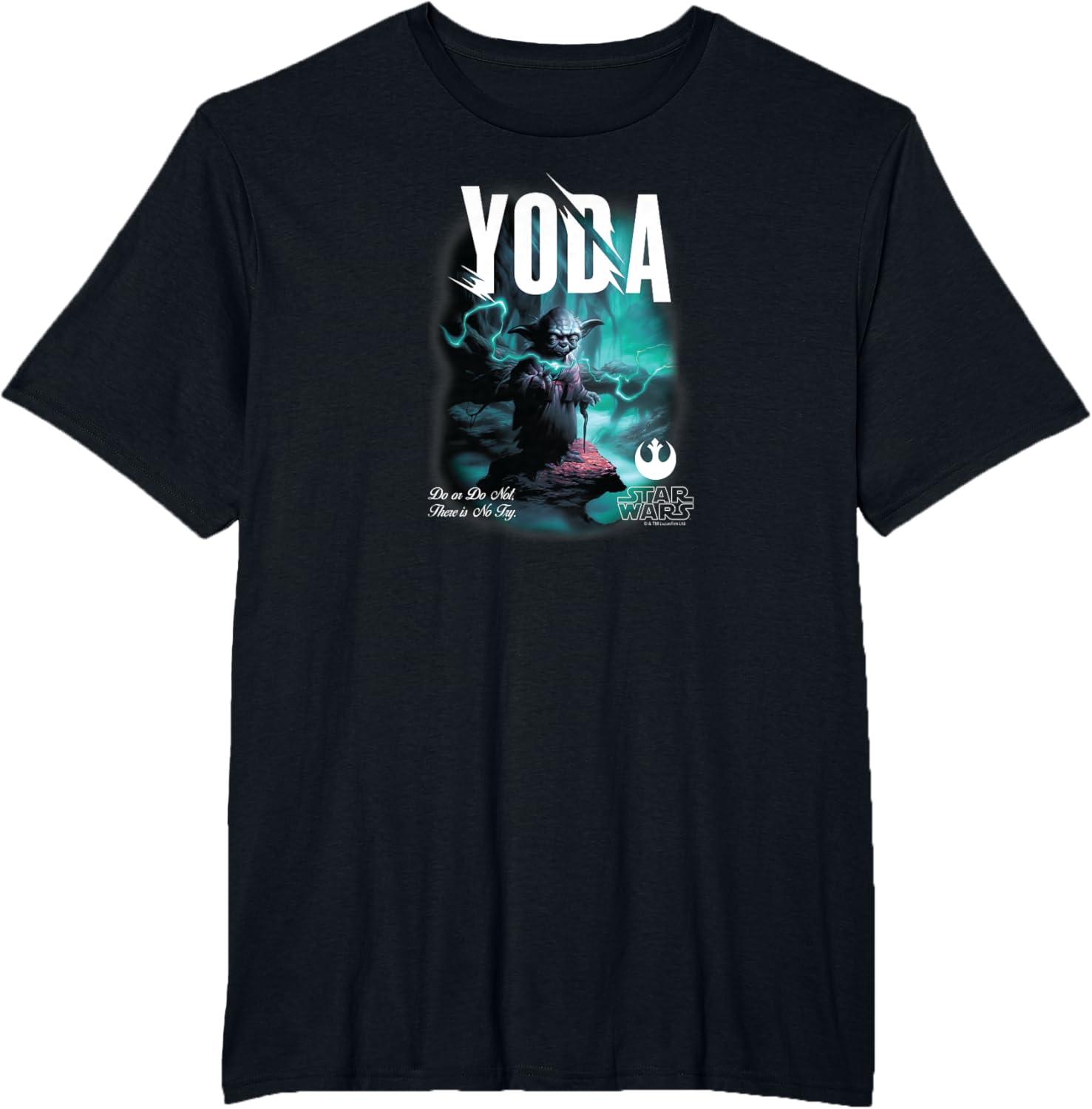 Master Yoda stands cloaked in mystic fog and searing lightning in this striking, high-voltage design. The bold “YODA” text slashes across the top, echoing the forceful presence of the Jedi Master below. His iconic quote “Do or do not. There is no try.” radiates wisdom as the Rebel Alliance emblem glows beside a mist-shrouded STAR WARS logo. This powerful moment captures the depth, mystery, and raw strength of the Force in one unforgettable look.