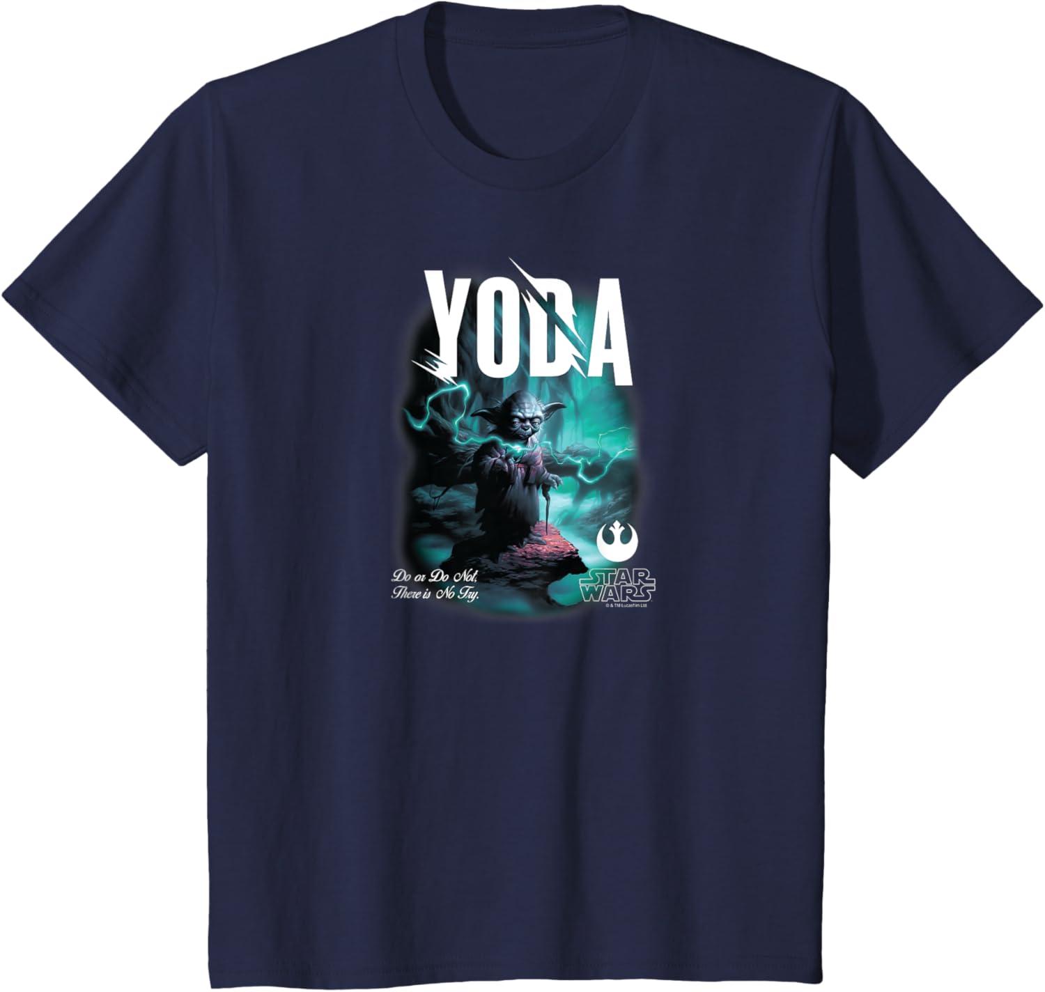 Master Yoda stands cloaked in mystic fog and searing lightning in this striking, high-voltage design. The bold “YODA” text slashes across the top, echoing the forceful presence of the Jedi Master below. His iconic quote “Do or do not. There is no try.” radiates wisdom as the Rebel Alliance emblem glows beside a mist-shrouded STAR WARS logo. This powerful moment captures the depth, mystery, and raw strength of the Force in one unforgettable look.
