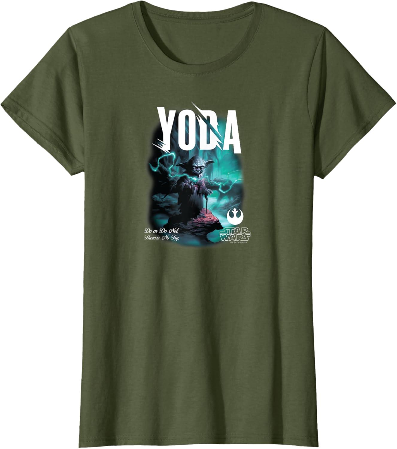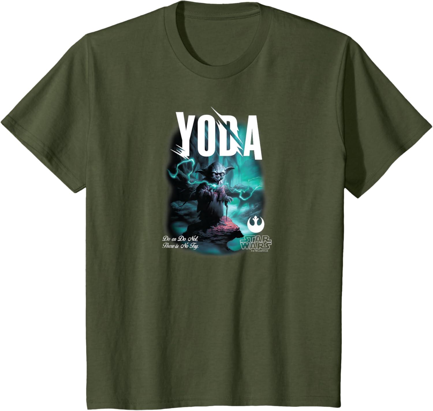 Master Yoda stands cloaked in mystic fog and searing lightning in this striking, high-voltage design. The bold “YODA” text slashes across the top, echoing the forceful presence of the Jedi Master below. His iconic quote “Do or do not. There is no try.” radiates wisdom as the Rebel Alliance emblem glows beside a mist-shrouded STAR WARS logo. This powerful moment captures the depth, mystery, and raw strength of the Force in one unforgettable look.