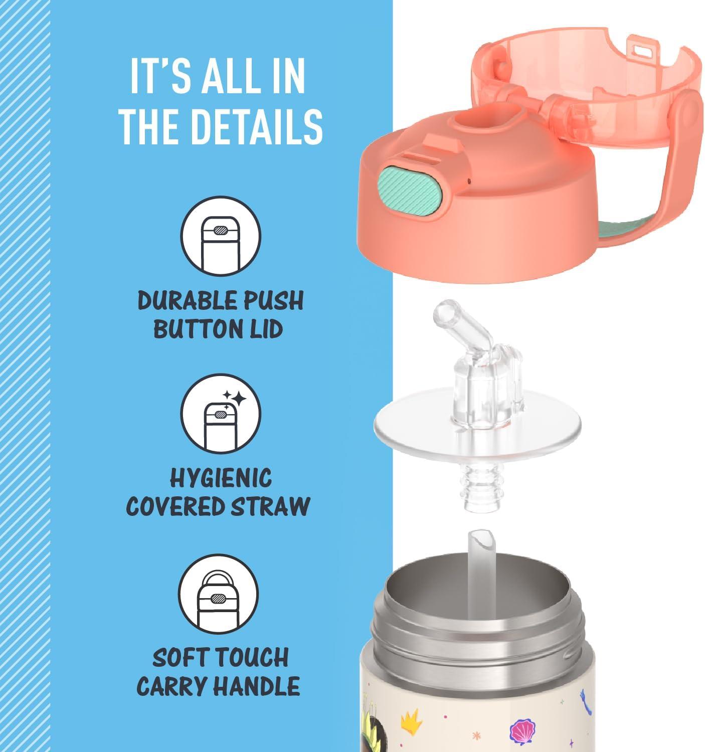 The FUNtainer® 12oz Vacuum Insulated Stainless Steel Water Bottle with Straw keeps drinks cold for up to 12 hours. Our kids water bottles are built so their drinks are as cool on the inside as they look on the outside. Kids stay hydrated and parents stay happy. The double wall stainless steel construction is built to handle drops, dings and assorted roughhousing. Includes an integrated carry handle with soft-touch grip, making it easy for kids to carry with them throughout the day. Includes a hygienically covered silicone straw which is removable for easy cleaning. To clean, you can pop your FUNtainer water bottle in the dishwasher; however hand washing is recommended. Not for use with hot liquids.