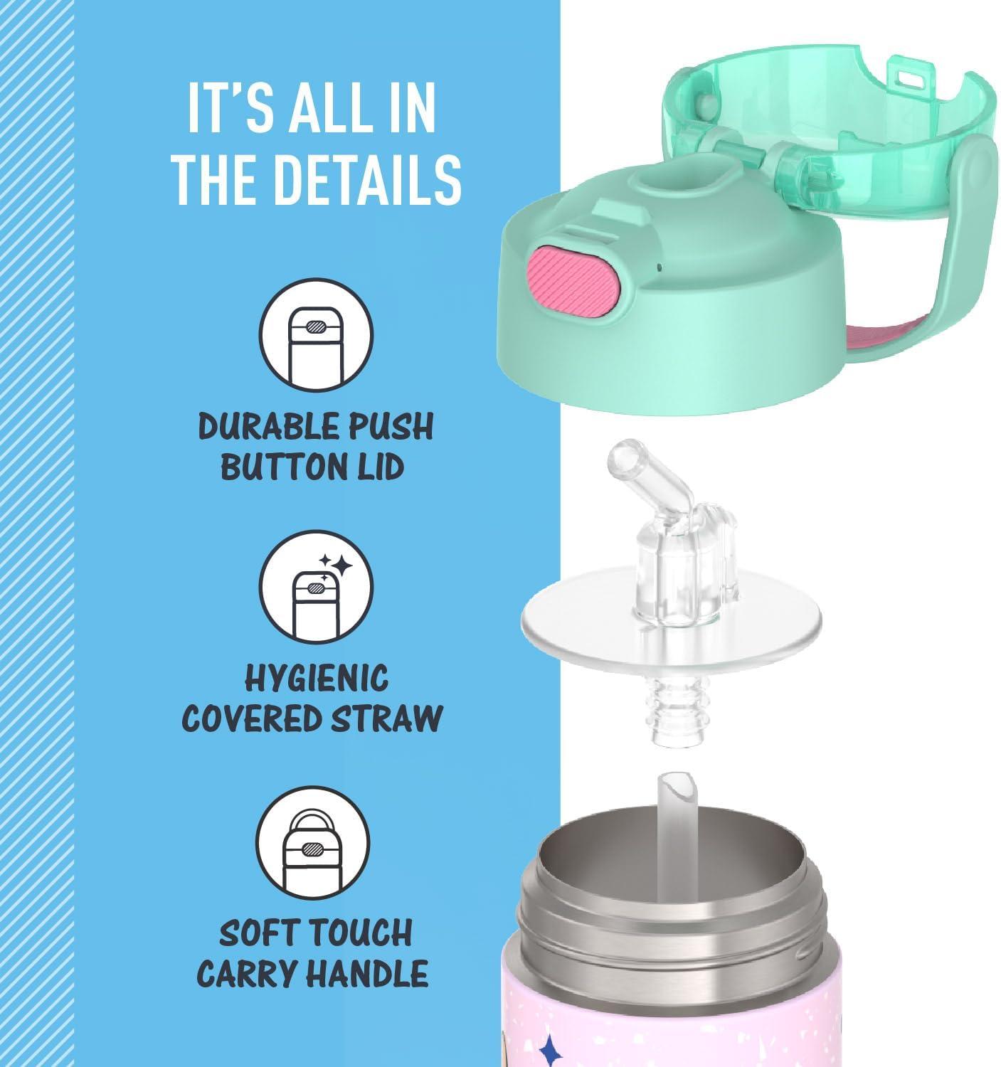 The FUNtainer® 12oz Vacuum Insulated Stainless Steel Water Bottle with Straw keeps drinks cold for up to 12 hours. Our kids water bottles are built so their drinks are as cool on the inside as they look on the outside. Kids stay hydrated and parents stay happy. The double wall stainless steel construction is built to handle drops, dings and assorted roughhousing. Includes an integrated carry handle with soft-touch grip, making it easy for kids to carry with them throughout the day. Includes a hygienically covered silicone straw which is removable for easy cleaning. To clean, you can pop your FUNtainer water bottle in the dishwasher; however hand washing is recommended. Not for use with hot liquids.